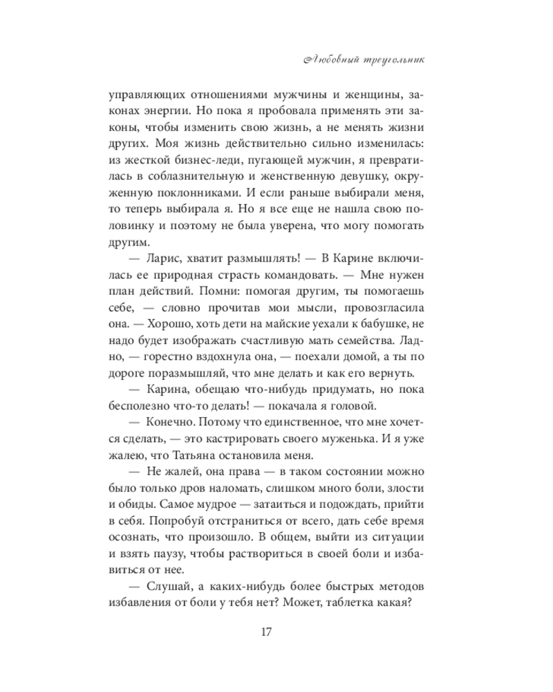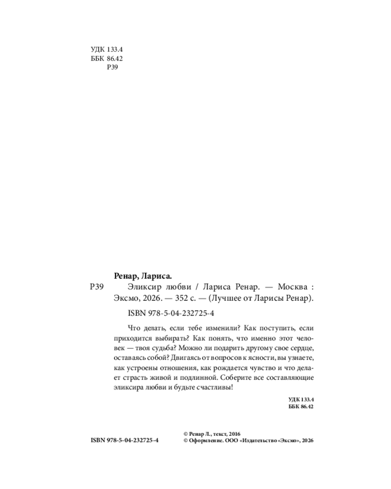 💳 Оплатить за товар можно при получении 🇰🇿 Есть бесплатная доставка по Казахстану от 1 дня 🎁 Копите бонусы с каждой покупки Серия: Лучшее от Ларисы Ренар «Эликсир любви» Ларисы Ренар — книга-лонгселлер о чувствах, выборе и внутренней силе женщины. В форме увлекательного романа автор рассказывает о любви без иллюзий и крайностей — о сомнениях, притяжении, сложных решениях на пути к гармоничным отношениям. Шаг за шагом книга помогает лучше понять себя и свои чувства, увидеть привычные сценарии со стороны и услышать собственную интуицию. Шаг за шагом, страница за страницей, вы соберете собственный «эликсир», постигая законы любви, скрытые механизмы притяжения и тонкое искусство страсти. |