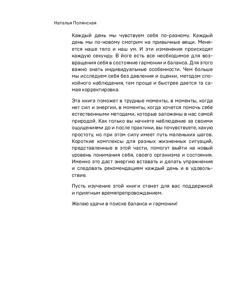 Серия: Время йоги. Практики, доступные каждому Ваше тело говорит с вами. Вы готовы его услышать? Усталость, стресс, тревожность, боли в спине, бессонница... Знакомо? Современный ритм жизни истощает нас физически и ментально. Мы теряем связь с собой, забываем слушать свое тело, игнорируем сигналы, которые оно нам посылает. Эта книга — ваш личный проводник к здоровью и гармонии. Йогатерапевт Наталья Полянская, с которой занимаются более 100 000 человек, создала комплексную систему самопомощи, объединяющую древнюю мудрость йоги и аюрведы с практическими решениями для современного человека.