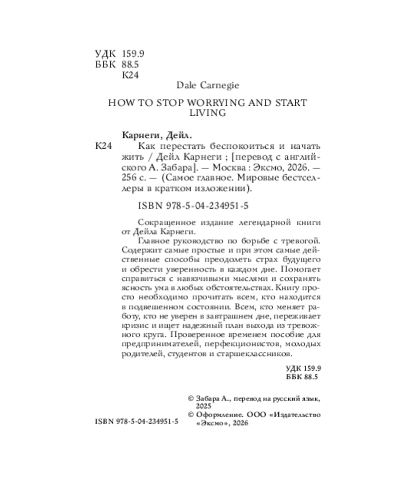 💳 Оплатить за товар можно при получении 🇰🇿 Есть бесплатная доставка по Казахстану от 1 дня 🎁 Копите бонусы с каждой покупки Серия: Самое главное. Мировые бестселлеры в кратком изложении Сокращенное издание легендарной книги от Дейла Карнеги. Главное руководство по борьбе с тревогой. Содержит самые простые и при этом самые действенные способы преодолеть страх будущего и обрести уверенность в каждом дне. Помогает справиться с навязчивыми мыслями и сохранять ясность ума в любых обстоятельствах. Книгу просто необходимо прочитать всем, кто находится в подвешенном состоянии. Всем, кто меняет работу, кто не уверен в завтрашнем дне, переживает кризис и ищет надежный план выхода из тревожного круга. Проверенное временем пособие для предпринимателей, перфекционистов, молодых родителей, студентов и старшеклассников. |