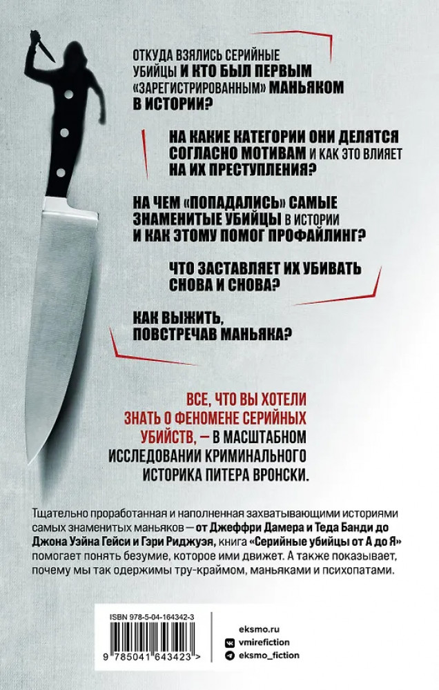 Масштабное исследование психологии серийных убийц, включающее десятки самых известных имен — от Джеффри Дамера и Теда Банди до Джона Уэйна Гейси и Гэри Риджуэя. Питер Вронски рассматривает происхождение феномена серийных убийств, классифицирует маньяков по мотивам и моделям поведения и показывает, как эти различия отражаются на их преступлениях. Автор подробно разбирает методы убийств, типичные ошибки преступников и роль профайлинга в их поимке. Книга отвечает на ключевые вопросы жанра true crime — почему они убивают, как выбирают жертв и почему продолжают снова и снова.