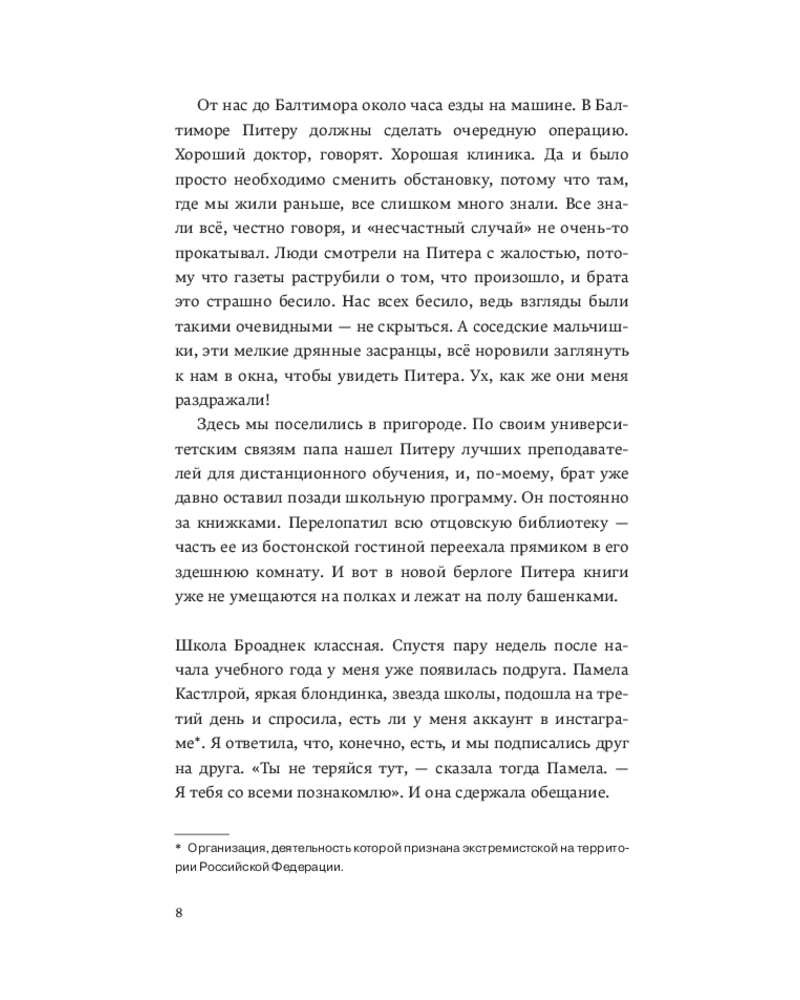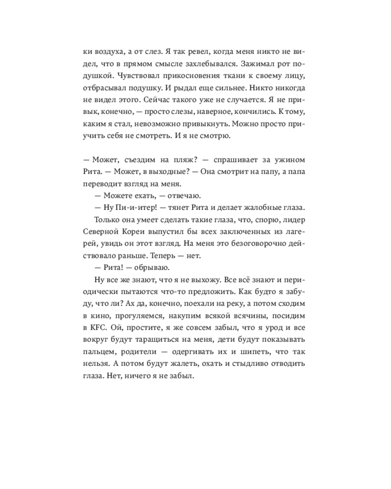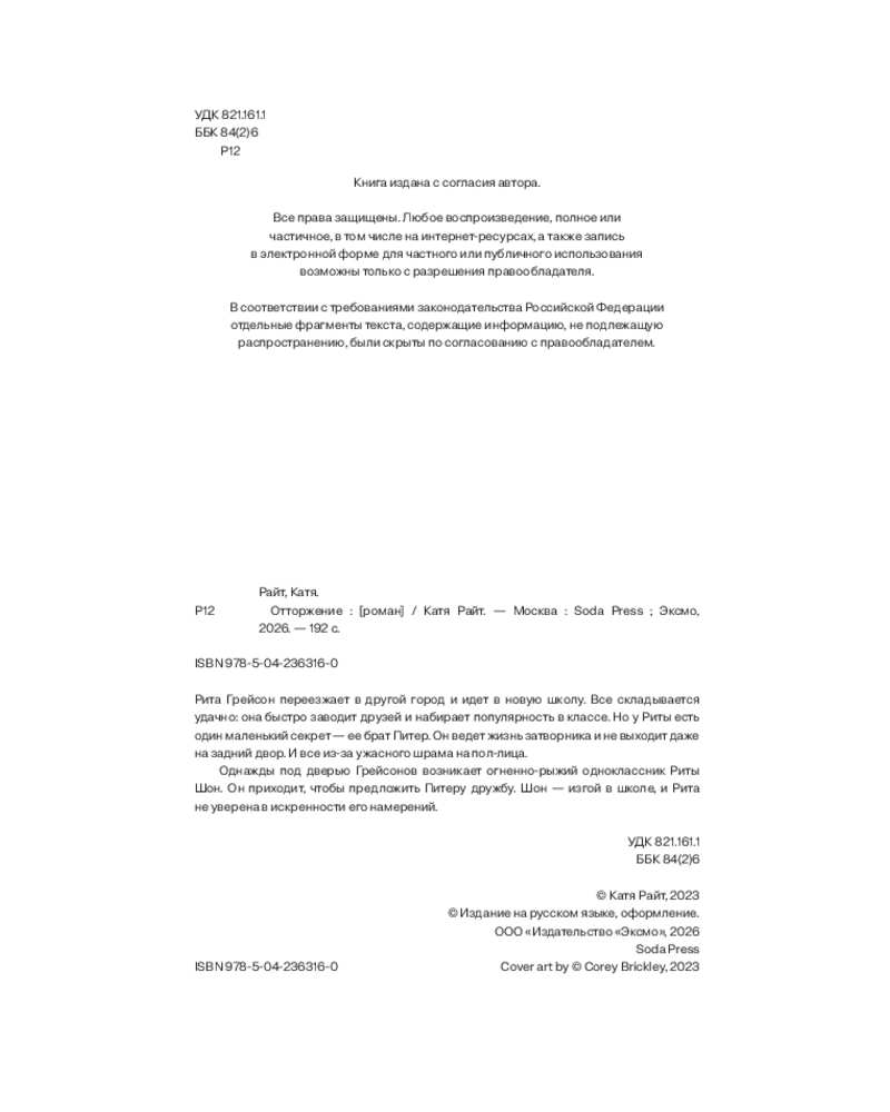 💳 Оплатить за товар можно при получении 🇰🇿 Есть бесплатная доставка по Казахстану от 1 дня 🎁 Копите бонусы с каждой покупки Серия: Без правил Рита Грейсон переезжает в другой город и идет в новую школу. Все складывается удачно: она быстро заводит друзей и набирает популярность в классе. Но у Риты есть один маленький секрет — ее брат Питер. Он ведет жизнь затворника и не выходит даже на задний двор. И все из-за ужасного шрама на пол-лица. |