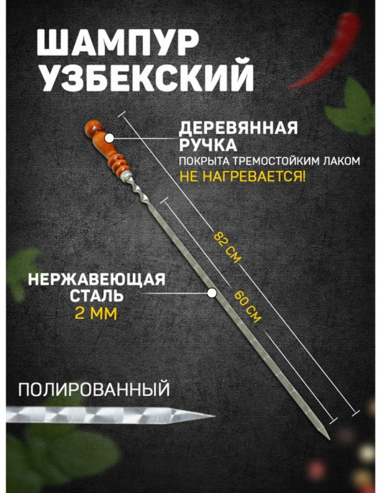 Шафран Шампур с деревянной ручкойВ данный момент этот товар отсутствует в продаже. Возможно, у нас найдется аналогичный или похожий товар здесь. Шампур идеально подходит для приготовления шашлыка и других блюд на мангале. Шампур изготовлен из высококачественной нержавеющей стали, размер и толщина которой обеспечивает равномерную прожарку и сохранение сочности мяса. Резная деревянная рукоять не только придает шарм внешнему виду шампура, но и обеспечивает удобный захват и предотвращает ожоги. Набор узбекских шампуров станет отличным подарком для ценителя отдыха на природе и загородной жизни. |