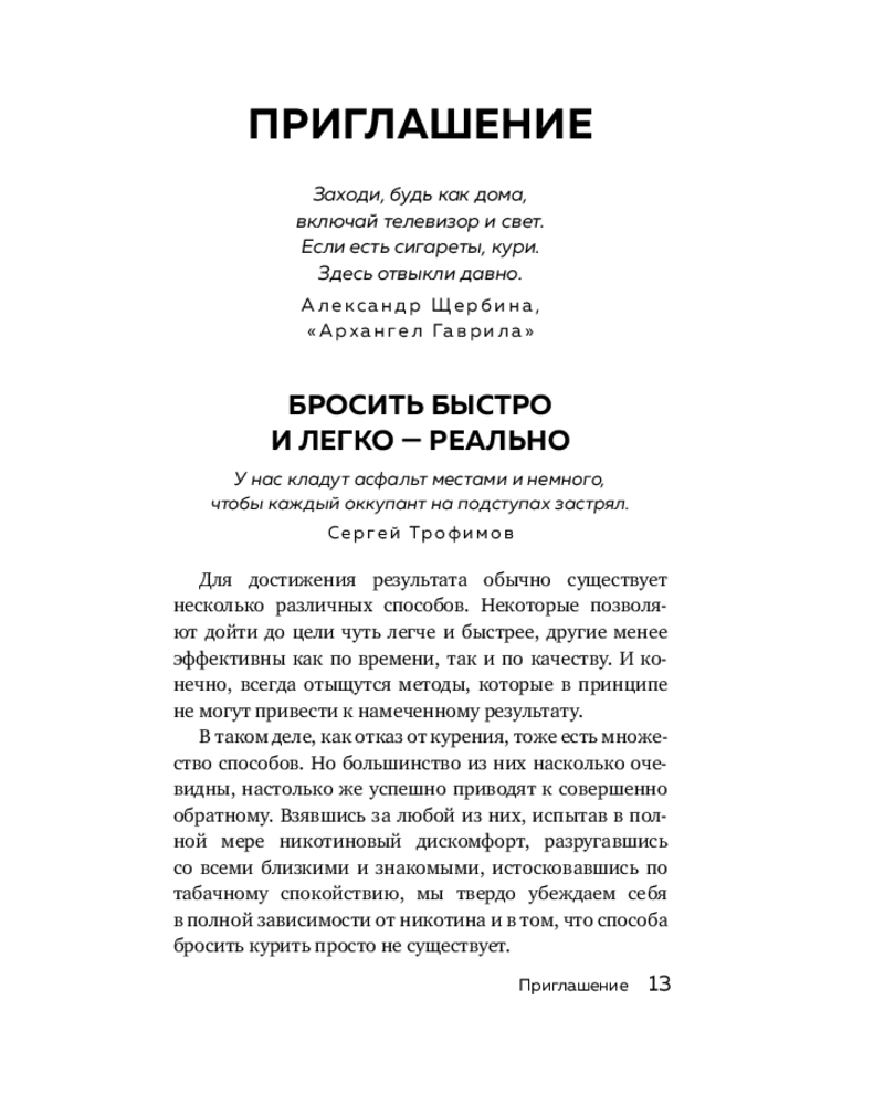 Именно поэтому Тимофей Кудряшов учит в первую очередь менять свое отношение к курению и сигаретам — учит не хотеть курить. Прочитав эту книгу, вы узнаете для себя что-то новое, а может, повторите уже известные уроки, но иначе — так, что, дочитав последнюю страницу, поймете: время пришло. |