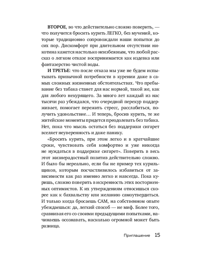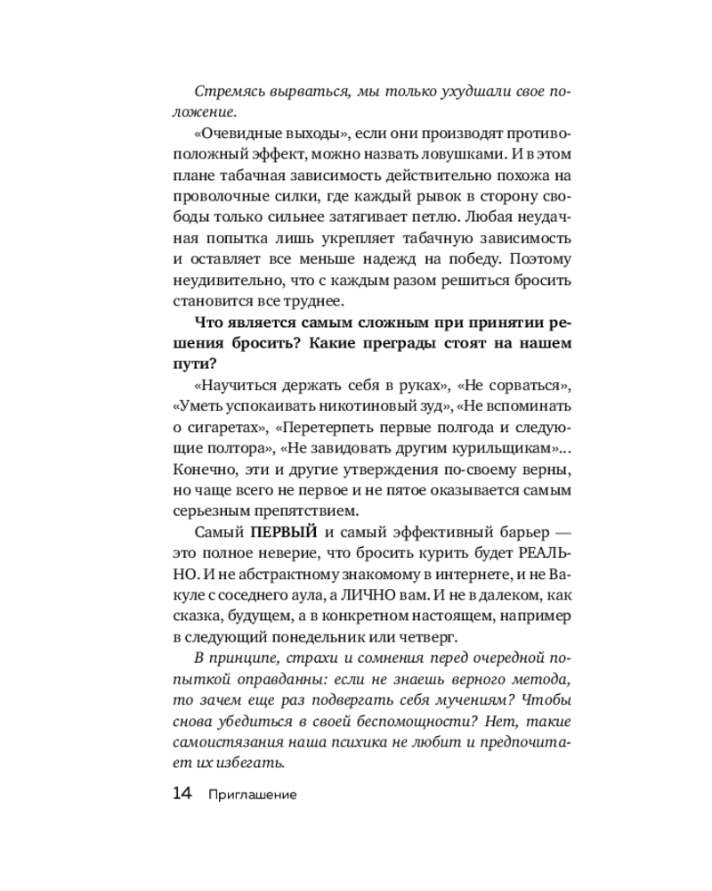Автор этой книги, Тимофей Кудряшов, уверенно заявляет: да, бросить курить легко и навсегда возможно, более того, правильным является именно мягкий и осознанный отказ от сигарет, понимание, что ты больше не хочешь курить. Ведь что происходит, когда мы изнуряем себя диетами, каждую ночь думая о шоколаде или бутерброде с колбасой? Правильно, рано или поздно мы срываемся, и уже никакие великие цели и рациональные мысли не могут нас удержать.