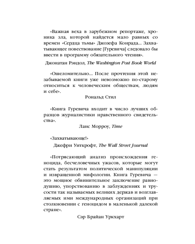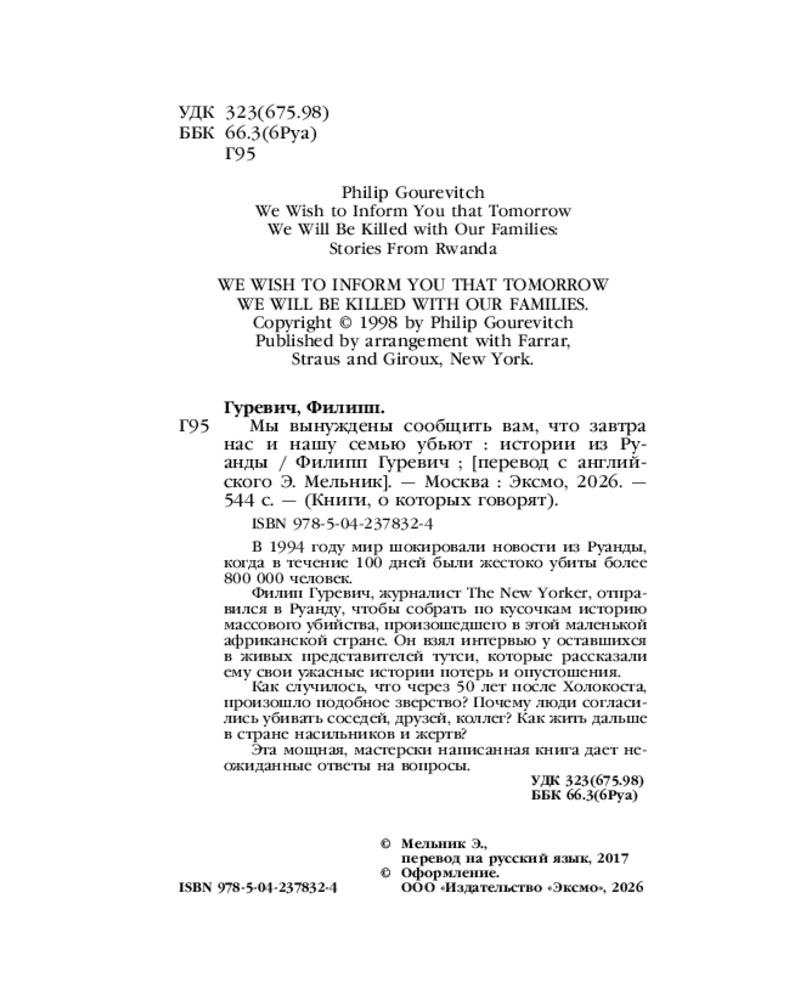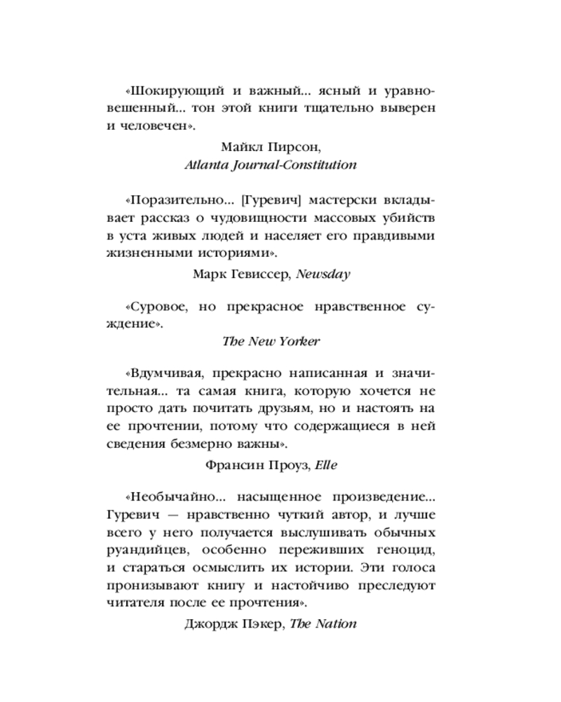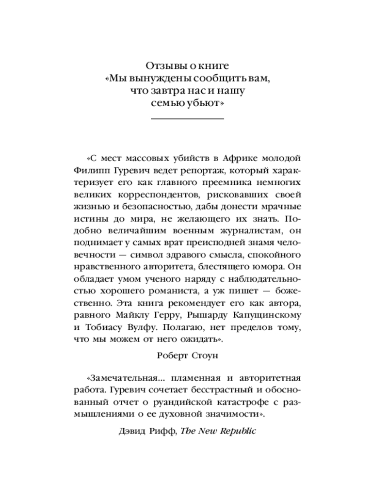 💳 Оплатить за товар можно при получении 🇰🇿 Есть бесплатная доставка по Казахстану от 1 дня 🎁 Копите бонусы с каждой покупки Серия: Книги, о которых говорят В 1994 году мир шокировали новости из Руанды, когда в течение 100 дней были жестоко убиты более 800 000 человек. Филип Гуревич, журналист The New Yorker, отправился в Руанду, чтобы собрать по кусочкам историю массового убийства, произошедшего в этой маленькой африканской стране. Он взял интервью у оставшихся в живых представителей тутси, которые рассказали ему свои ужасные истории потерь и опустошения. |
