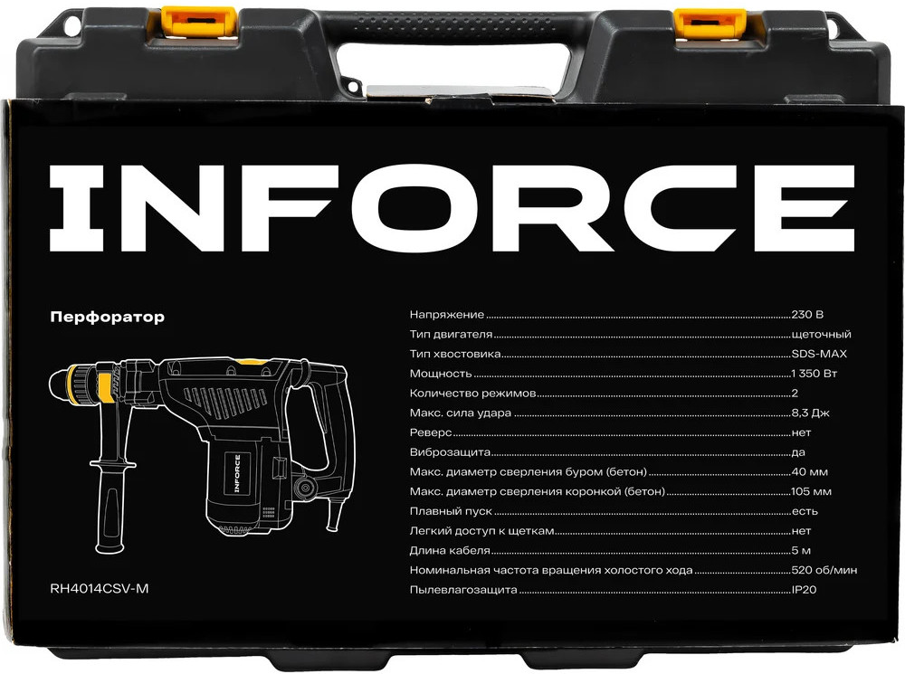 Inforce Перфоратор RH4014SCV-MВ данный момент этот товар отсутствует в продаже. Возможно, у нас найдется аналогичный или похожий товар здесь. Перфоратор Inforce RH4014CSV-M — это мощный перфоратор с системой виброзащиты для тяжелых работ. SDS-MAX хвостовик, плавный пуск и большая сила удара позволяют работать с бетоном и армированными конструкциями. Функция постоянной скорости (не замедляется и не ускоряется при изменении нагрузки.) Светодиодная индикация необходимости замены угольных щеток и неисправности кабеля питания. Кабель питания длиной 5 метров. Поставляется в ударопрочном пластиковом кейсе для транспортировки и безопасного хранения инструмента и буров. В комплекте смазка для буров и ветошь. Шарнирный (поворотный) ввод кабеля. Кабельный шарнир — снижает нагрузку на кабель предотвращая перегиб и повреждение. |