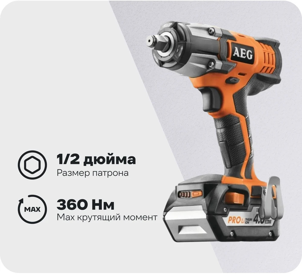 Аккумуляторный гайковерт AEG BSS 18C12Z LI-402C — самый быстрый на рынке. Крутящий момент 360 Нм расширяет сферу применения инструмента. Металлический корпус редуктора и шестерни гарантируют долгий срок службы. Для удобной работы в темном помещении, предусмотрена встроенная трехточечная подсветка. Скорость регулируется нажатием на клавишу «Пуск», что позволяет работать с разными материалами. Рукоятка с покрытием из микротекстуры обеспечивает надежный хват.