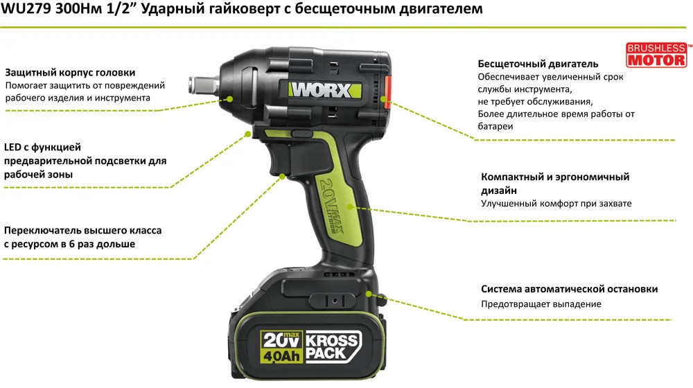Worx Professional Гайковерт ударный WU279.1В данный момент этот товар отсутствует в продаже. Возможно, у нас найдется аналогичный или похожий товар здесь. Аккумуляторный ударный бесщеточный гайковерт WORX Professional WU279.1 20В, 360Нм, 4Ач х2, ЗУ 6А, сумка WU279.1 подойдет для самостоятельной замены колесных дисков, а также проведения строительных или бытовых работ. Ударный аккумуляторный гайковерт обладает оптимальным балансом веса и мощности. Бесщеточный двигатель увеличивает крутящий момент гайковерта на 25% и продлевает ресурс инструмента до 50%. В сравнении с обычным двигателем, бесщеточная конструкция меньше нагревается и создает минимум шума при работе. В комплект поставки инструмента входят сразу 2 универсальных аккумулятора WORX Professional 20В. Работайте со вторым аккумулятором, пока разряженная батарея восстановит емкость. Вместе с гайковертом вы также получаете быстрое зарядное устройство на 6А. Универсальное крепление типа «квадрат» с патроном 1/2 дюйма позволяет легко подобрать оснастку под ваши потребности. Современная система фиксации ускоряет процесс замены бит, что дает возможность быстро подготовить инструмент к работе. |