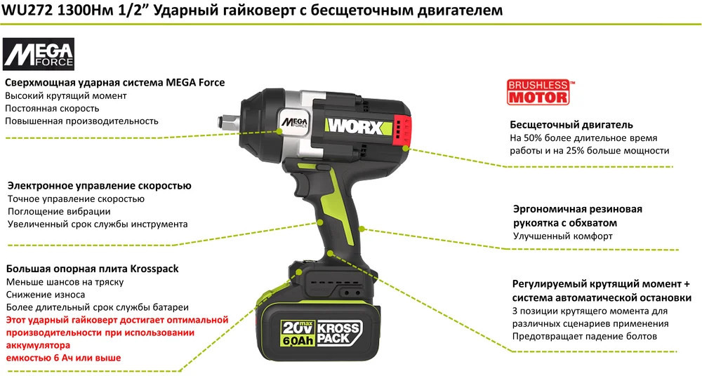 Worx Professional Гайковерт ударный WU272.9В данный момент этот товар отсутствует в продаже. Возможно, у нас найдется аналогичный или похожий товар здесь. Аккумуляторный ударный гайковерт WORX Professional WU272.9 представляет собой профессиональный инструмент, который сочетает в себе мощность и удобство использования. Оснащенный бесщеточным двигателем, он обеспечивает высокий крутящий момент до 1300 Нм, что позволяет эффективно справляться с самыми сложными задачами. Гайковерт имеет три режима частоты вращения шпинделя, максимальная из которых достигает 1900 об/мин, а также регулируемую частоту ударов до 2400 уд/мин, что делает его универсальным для различных работ. Квадратный патрон с отверстием и фрикционным кольцом размером 1/2 дюйма обеспечивает надежную фиксацию насадок. Наличие реверса и подсветки упрощает работу в труднодоступных местах и при недостаточном освещении. Компактные размеры и вес 3.2 кг делают его удобным в транспортировке и использовании. |