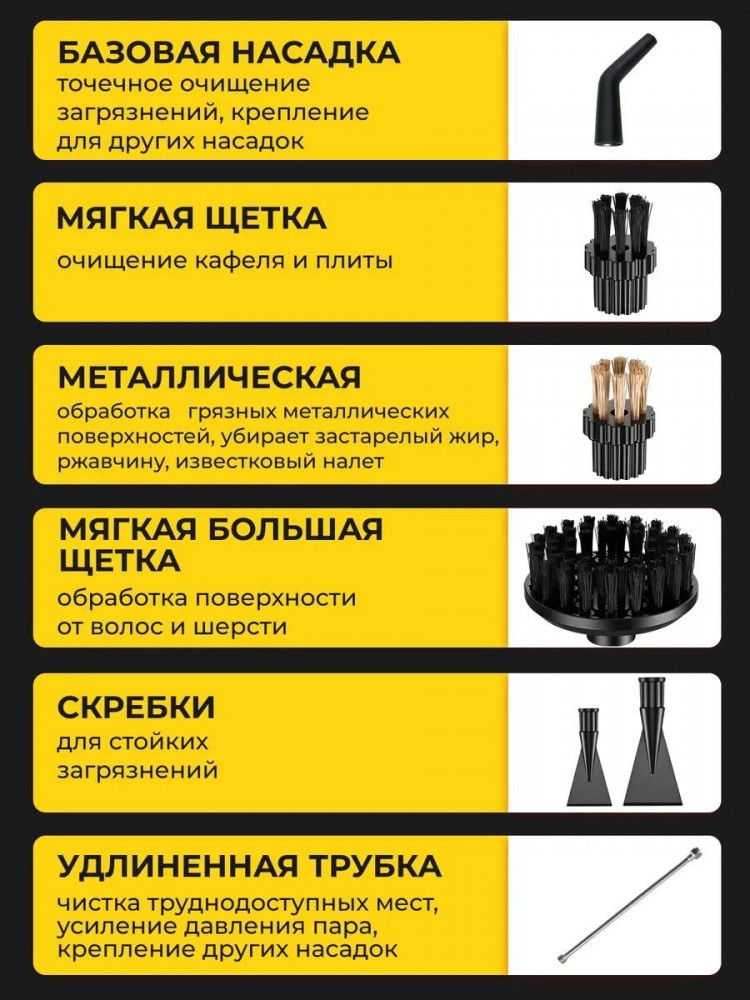 Профессиональный пароочиститель для уборки дома — это многофункциональная техника, созданная для качественной чистки различных поверхностей. Он отлично справляется с уборкой в доме и на кухне. Использует пар для эффективного удаления грязи и бактерий. Этот мощный парогенератор оснащен восьмью насадками, что делает его универсальным помощником. Каждая насадка предназначена для конкретных мест. Мягкая щетка позволяет безопасно очищать чувствительные поверхности, такие как полы или одежда. Паровой очиститель легко удаляет загрязнения с труднодоступных мест. Его можно использовать для мойки автомобиля и ухода за внутренним пространством машины. Паром очищаются места, где часто остаются следы курения или пыли.