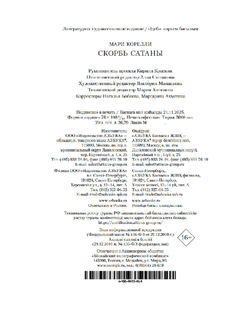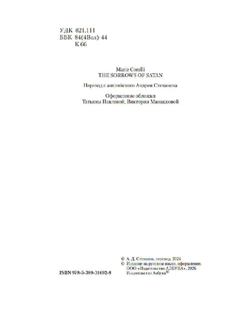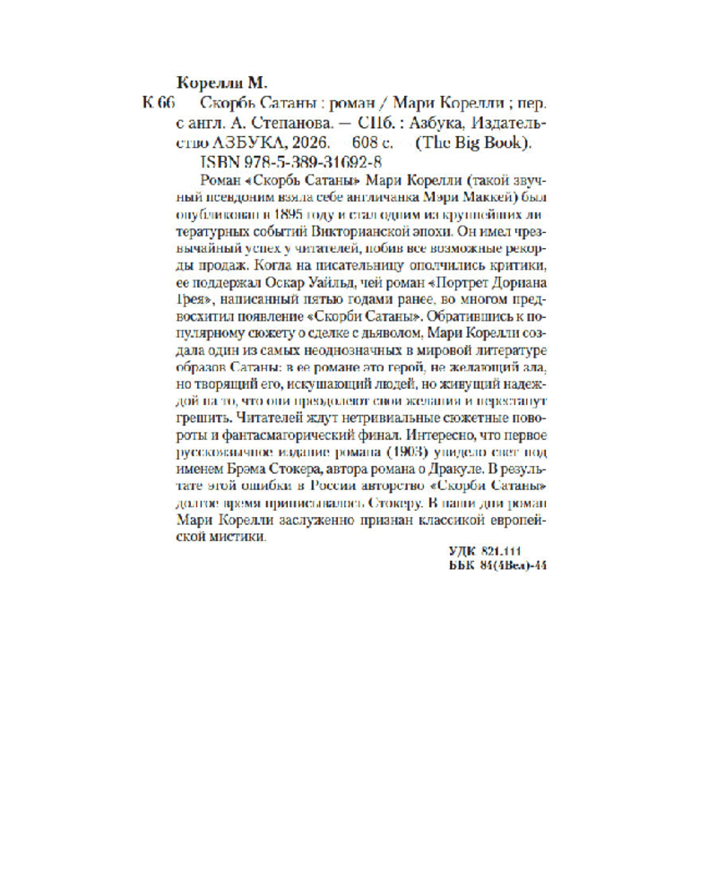 💳 Оплатить за товар можно при получении 🇰🇿 Есть бесплатная доставка по Казахстану от 1 дня 🎁 Копите бонусы с каждой покупки Серия: The Big Book (мягкая обложка) Роман «Скорбь Сатаны» Мари Корелли (такой звучный псевдоним взяла себе англичанка Мэри Маккей) был опубликован в 1895 году и стал одним из крупнейших литературных событий Викторианской эпохи. Он имел чрезвычайный успех у читателей, побив все возможные рекорды продаж. Когда на писательницу ополчились критики, ее поддержал Оскар Уайльд, чей роман «Портрет Дориана Грея», написанный пятью годами ранее, во многом предвосхитил появление «Скорби Сатаны». Обратившись к популярному сюжету о сделке с дьяволом, Мари Корелли создала один из самых неоднозначных в мировой литературе образов Сатаны: в ее романе это герой, не желающий зла, но творящий его, искушающий людей, но живущий надеждой на то, что они преодолеют свои желания и перестанут грешить. |