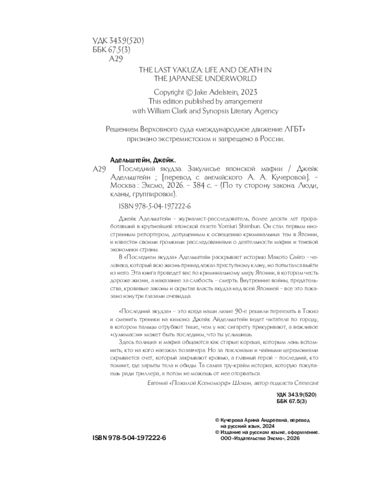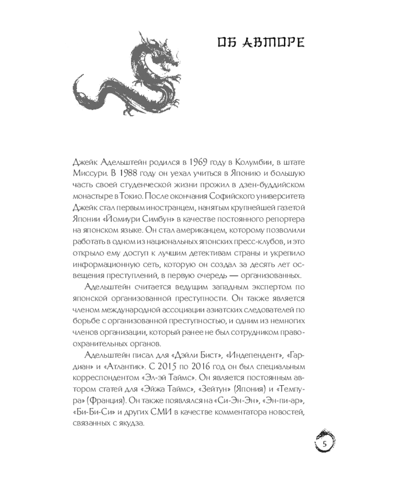 💳 Оплатить за товар можно при получении 🇰🇿 Есть бесплатная доставка по Казахстану от 1 дня 🎁 Копите бонусы с каждой покупки Серия: По ту сторону закона. Люди, кланы, группировки Джейк Адельштейн — журналист-расследователь, более десяти лет проработавший в крупнейшей японской газете Yomiuri Shimbun. Он стал первым иностранным репортером, допущенным к освещению криминальных тем в Японии, и известен своими громкими расследованиями о деятельности мафии и теневой экономики страны. |