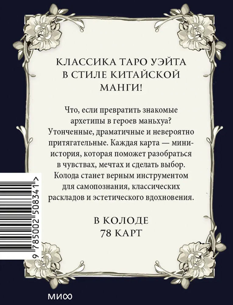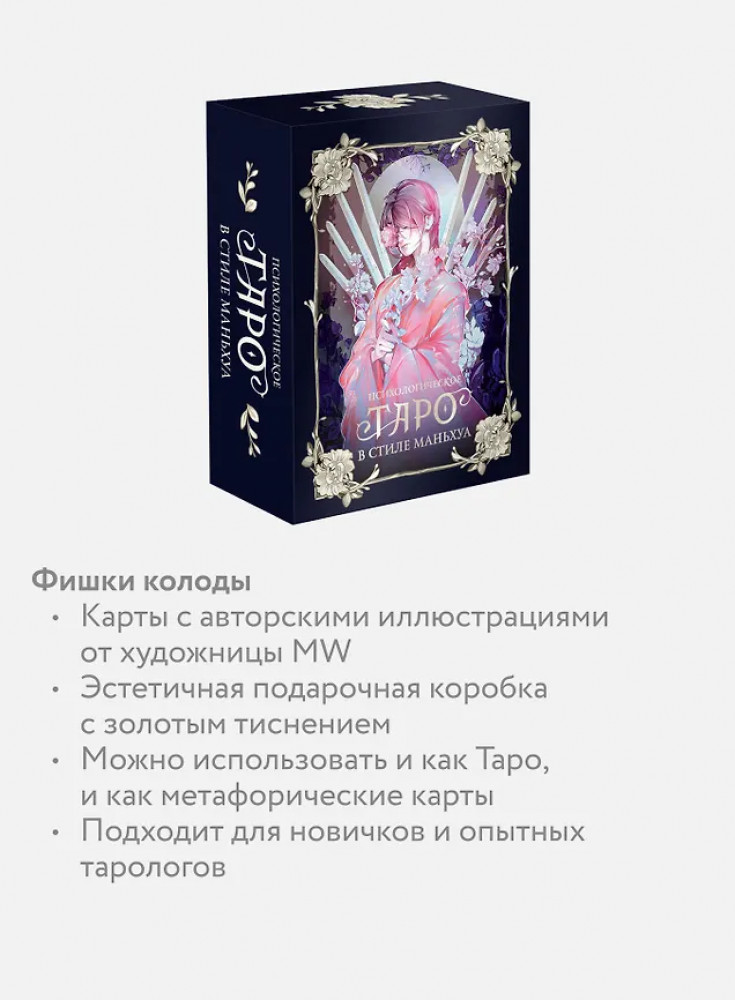 💳 Оплатить за товар можно при получении 🇰🇿 Есть бесплатная доставка по Казахстану от 1 дня 🎁 Копите бонусы с каждой покупки Серия: Таро МИФ Что, если превратить знакомые архетипы в героев маньхуа? Классическая колода Таро Уэйта из 78 карт, оформленная в узнаваемом стиле маньхуа. Каждая карта поможет разобраться в чувствах, мечтах и сделать выбор, когда сложно. Проективный инструмент для психологической работы, самопознания, классических раскладов и эстетического созерцания. |