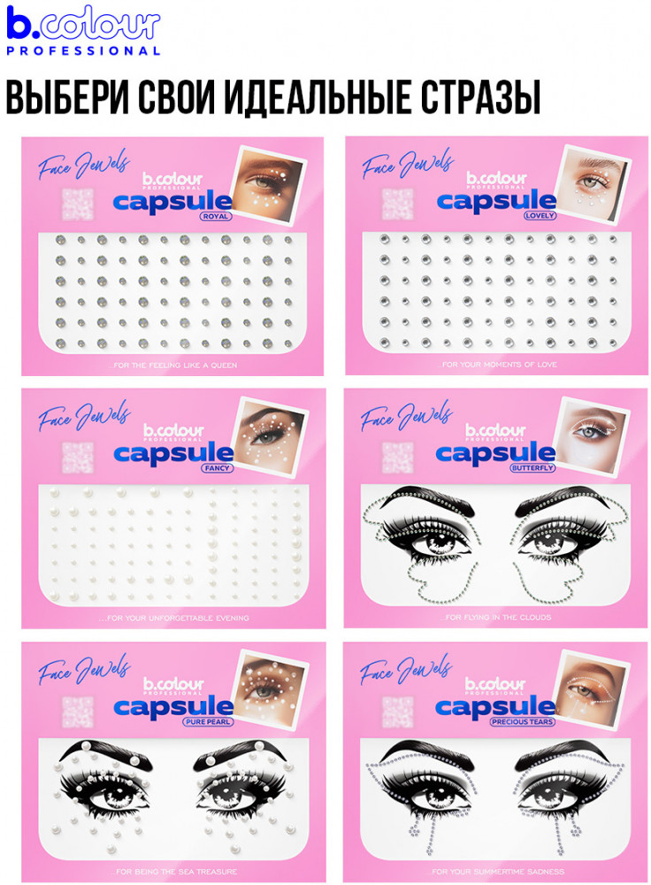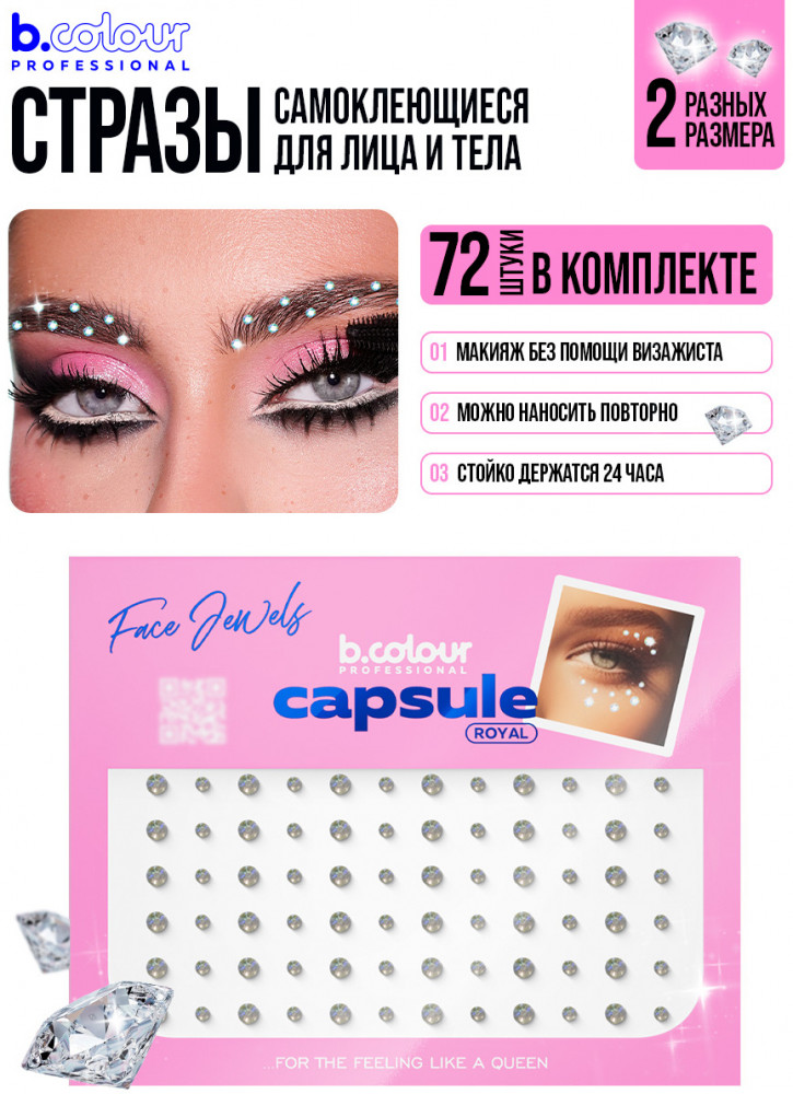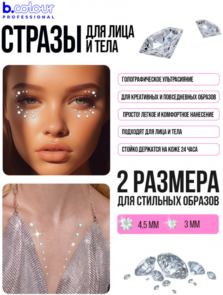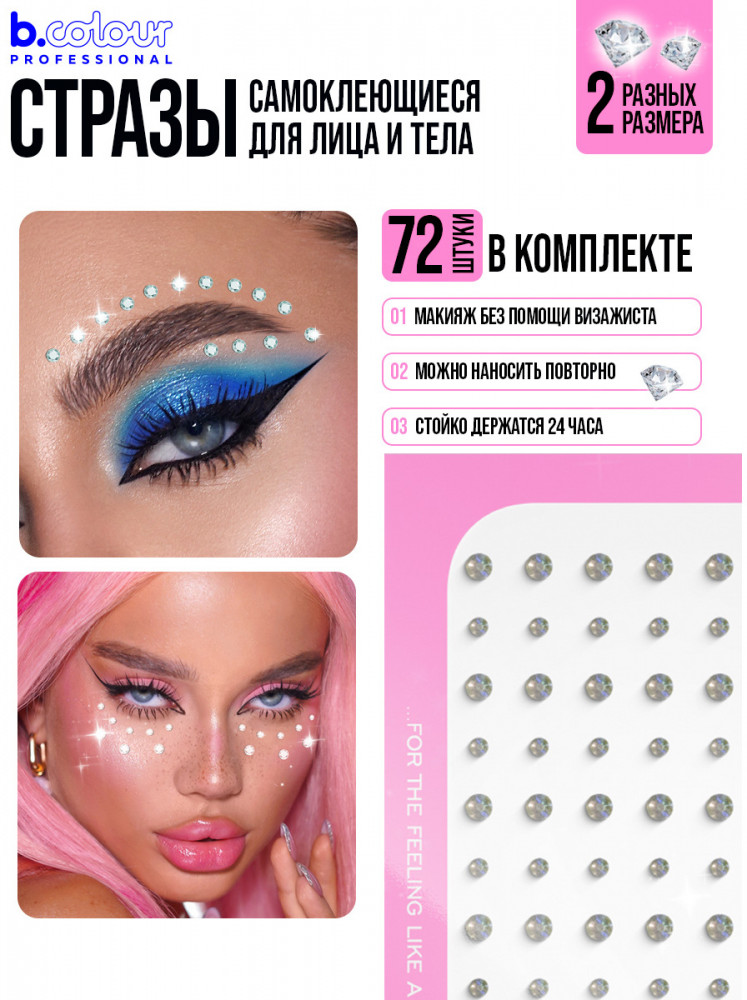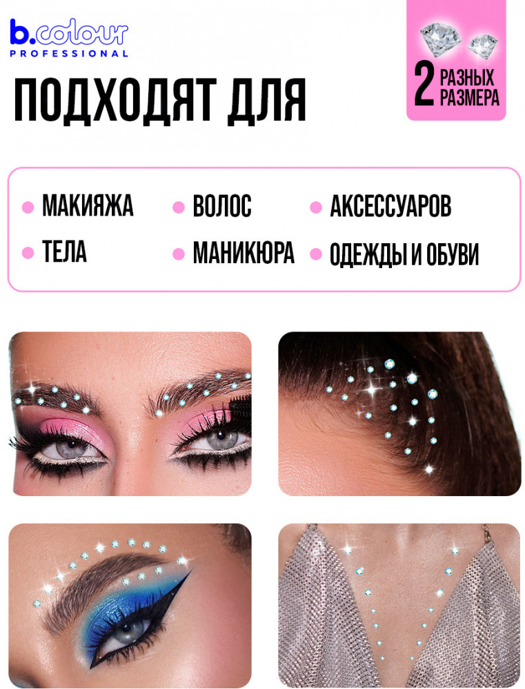 Стразы на глаза: подчеркни глаза, ресницы, скулы или губы, создавая великолепные образы для любого случая. Наклейки стразы помогут тебе сделать романтичный и нежный макияж, выложи стразы на лицо в форме сердечка или стразы для ресниц в уголки глаз. Уложи лаком и приклей стразы на волосы, милый аксессуар подарит образу игривость и очарование. Стразы для тела эффектно смотрятся на ключицах. Стразы для лица самоклеящиеся легко удаляются, не оставляя следов и дискомфорта. Самоклеящиеся стразы могут дополнить детский макияж, стразы для лица детские гипоаллергенны. Кристаллы идеально дополнят образ на праздники. Стразы подходят для гимнасток, вечеринок, свадеб, фотосессий и креативных образов. Набор страз B.colour Professional также подходит для маникюра: стразы для ногтей легко наносятся при помощи специального клея. Стразы клеевые представлены в маленьких и больших размерах, идеально подходящих для одежды, обуви и украшений. Стразы для рукоделия помогут тебе создать настоящие произведение искусства.