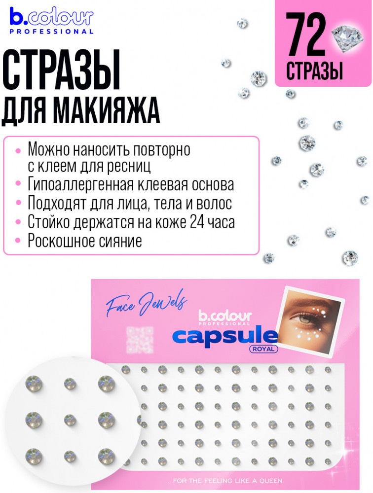 В данный момент этот товар отсутствует в продаже. Возможно, у нас найдется аналогичный или похожий товар здесь. Серия: Capsule Стразы для лица B.colour Professional Royal с роскошным голографическим сиянием. Стразы для волос, лица и тела прекрасно дополнят как нежный повседневный, так и яркий вечерний образ. Стразы клеевые самоклеящиеся Face Jewels легко и комфортно наносятся на кожу, стойко держатся до 24 часов. Стразы для макияжа можно наносить повторно при помощи косметического клея. Стразы на лицо для вечеринки придают блеск и сияние праздничным образам. Эти блестящие украшения подойдут для женщин, для детей, позволяя добавить яркие акценты в макияж и образ.