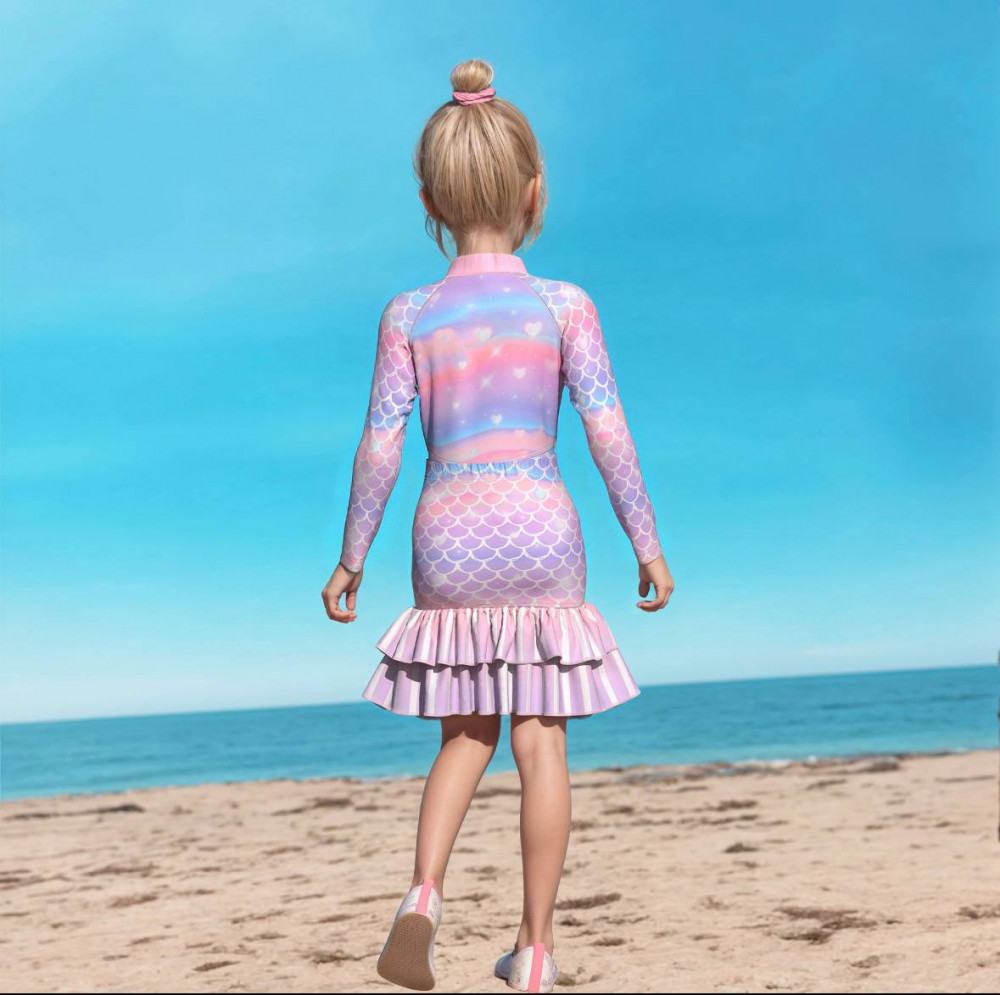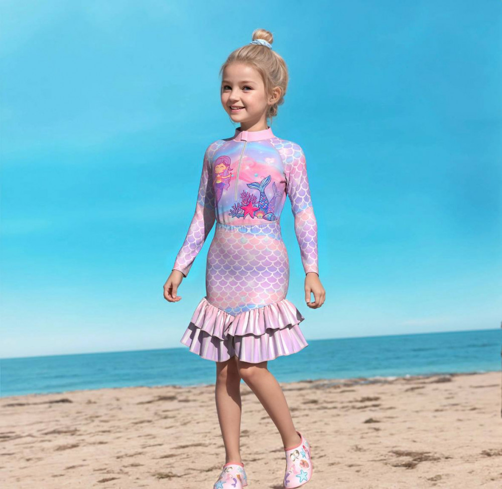 Детский цельный солнцезащитный купальник для девочек с длинными рукавами и с разрезным хвостом русалки