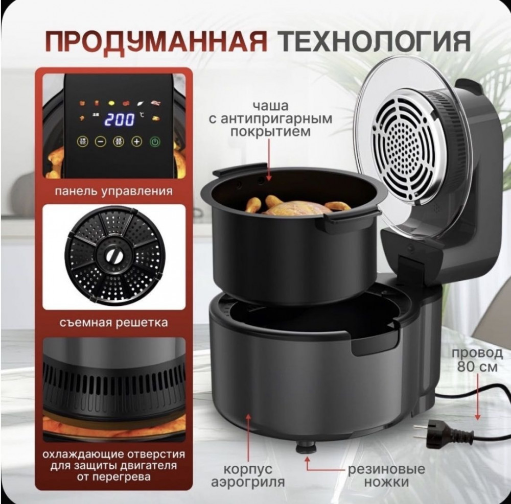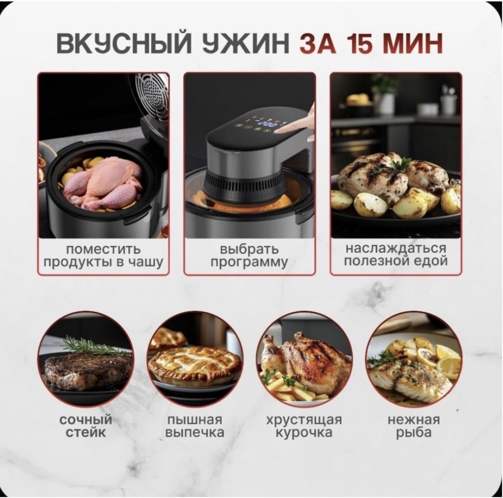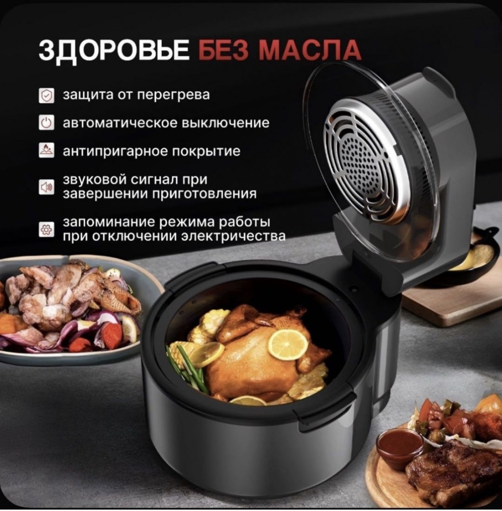 💳 Оплатить за товар можно при получении 🇰🇿 Есть бесплатная доставка по Казахстану от 1 дня 🎁 Копите бонусы с каждой покупки Аэрогриль 5 л 8 в 1 — это современный кухонный помощник для тех, кто ценит быстрое, вкусное и полезное питание. Устройство сочетает в себе сразу несколько функций: жарка, запекание, выпечка, разогрев, микро-пар, обезвоживание, гриль и хрустящая корочка. Вы можете готовить два блюда одновременно, экономя время и силы. Благодаря технологии циркуляции горячего воздуха аэрогриль позволяет готовить блюда с на 85% меньшим количеством жира, сохраняя натуральный вкус и пользу продуктов. Это идеальный выбор для здорового питания всей семьи. Вместительная чаша 5 литров отлично подойдёт как для повседневных блюд, так и для приёма гостей. |