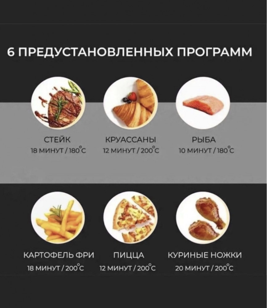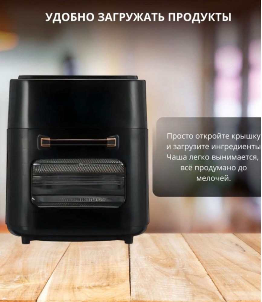 Аэрогриль подходит для приготовления мяса, рыбы, овощей, пиццы и выпечки, сохраняя натуральный вкус и сочность продуктов. Этот электрический аэрогриль сочетает удобство, универсальность и эффективность, делая каждый приём пищи вкусным и полезным. Идеальный выбор для кухни и ежедневного использования.