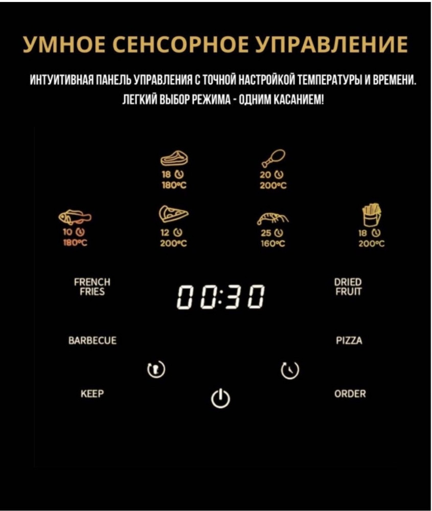 Объём 15 литров позволяет готовить порции на всю семью. Удобное сенсорное управление с таймером и регулировкой температуры позволяет точно настроить процесс готовки. Прозрачное окошко позволяет наблюдать за приготовлением, а антипригарная корзина обеспечивает лёгкое извлечение блюд и простую очистку.