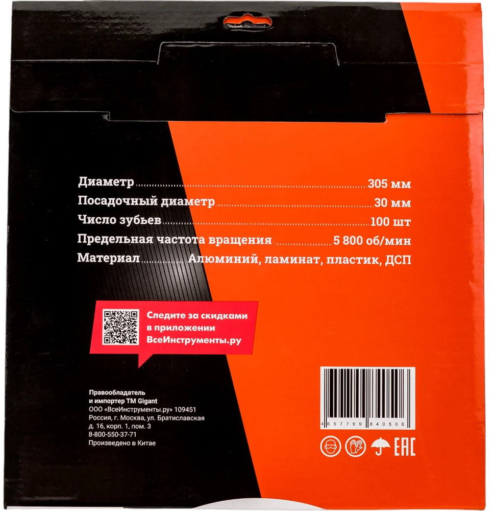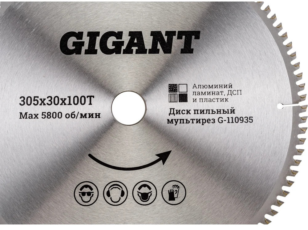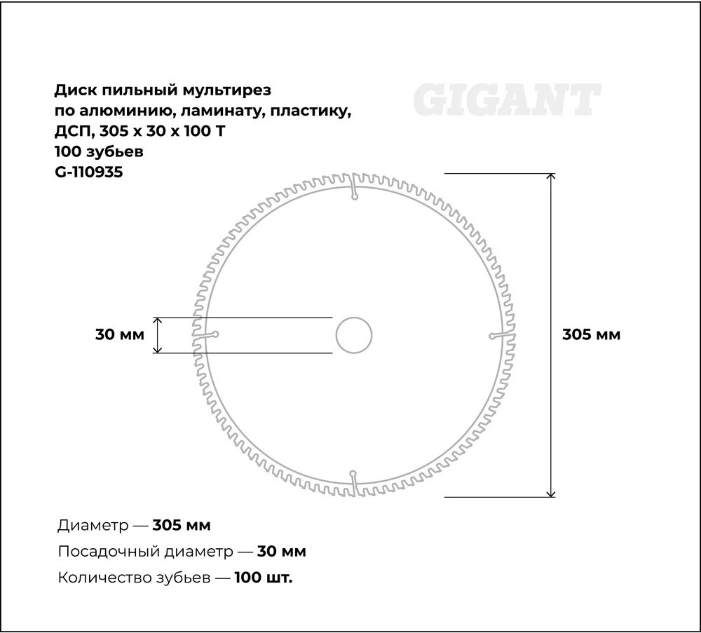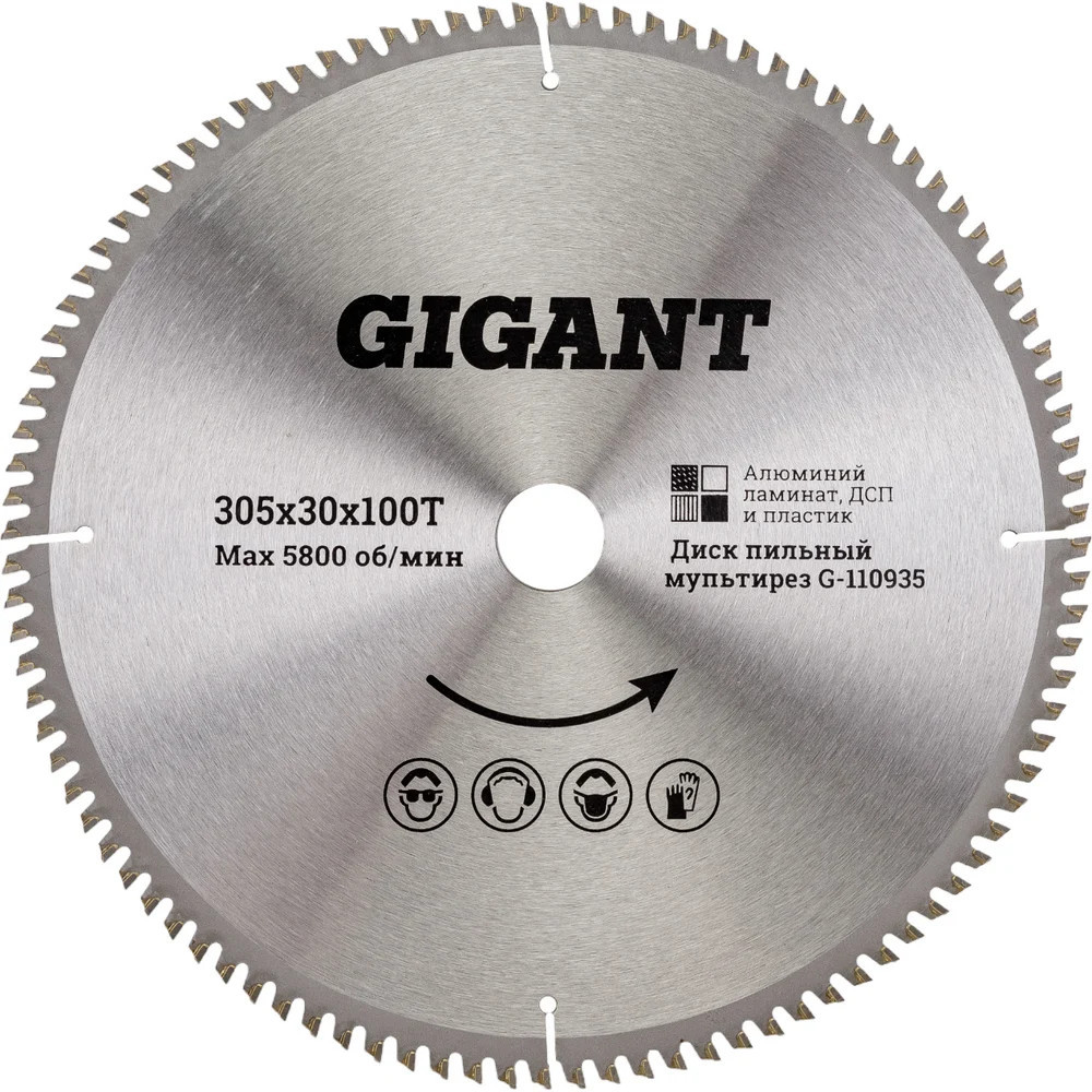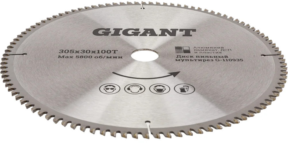 Пильный диск мультирез по алюминию, ламинату, пластику, ДСП 305×30×100Т 100 зубьев Gigant G-110935 используется с циркулярными пилами. Предназначен для пиления пластика, алюминия, ламината, ДСП и др. С помощью диска осуществляется поперечная и продольная обработка заготовок. Универсальный пильный диск удобен в использовании, так как нет необходимости постоянно менять оснастку при обработке различных материалов. Отшлифованные зубья оснащены твердосплавными пластинами (ВК8), за счет чего появляется возможность распиливать даже особо прочные материалы, не теряя при этом качество реза. Твердосплавные зубья диска выполнены в форме трапеции, а передний угол имеет отрицательную величину, за счет чего достигается качественный пропил тонких материалов. Заточка зубьев с трех сторон гарантирует эффективную работу.