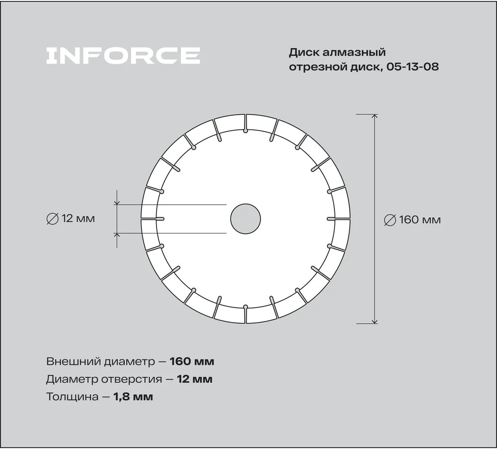 Алмазный отрезной диск Inforce 05-13-08 предназначен для точного и эффективного реза керамической плитки. Его сегментированная конструкция обеспечивает стабильность и долговечность при работе, а посадочный диаметр 22.2 мм позволяет использовать диск с большинством стандартных инструментов. Диск рассчитан на мокрый рез с использованием смазочно-охлаждающей жидкости, что способствует снижению перегрева и увеличению срока службы.