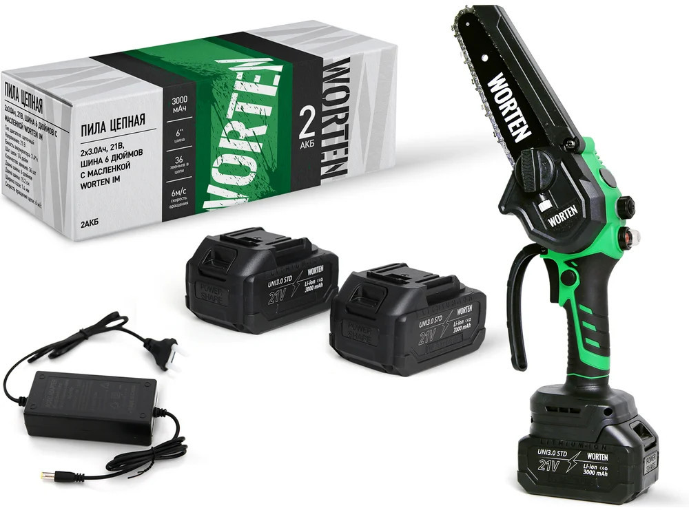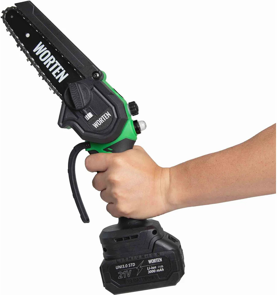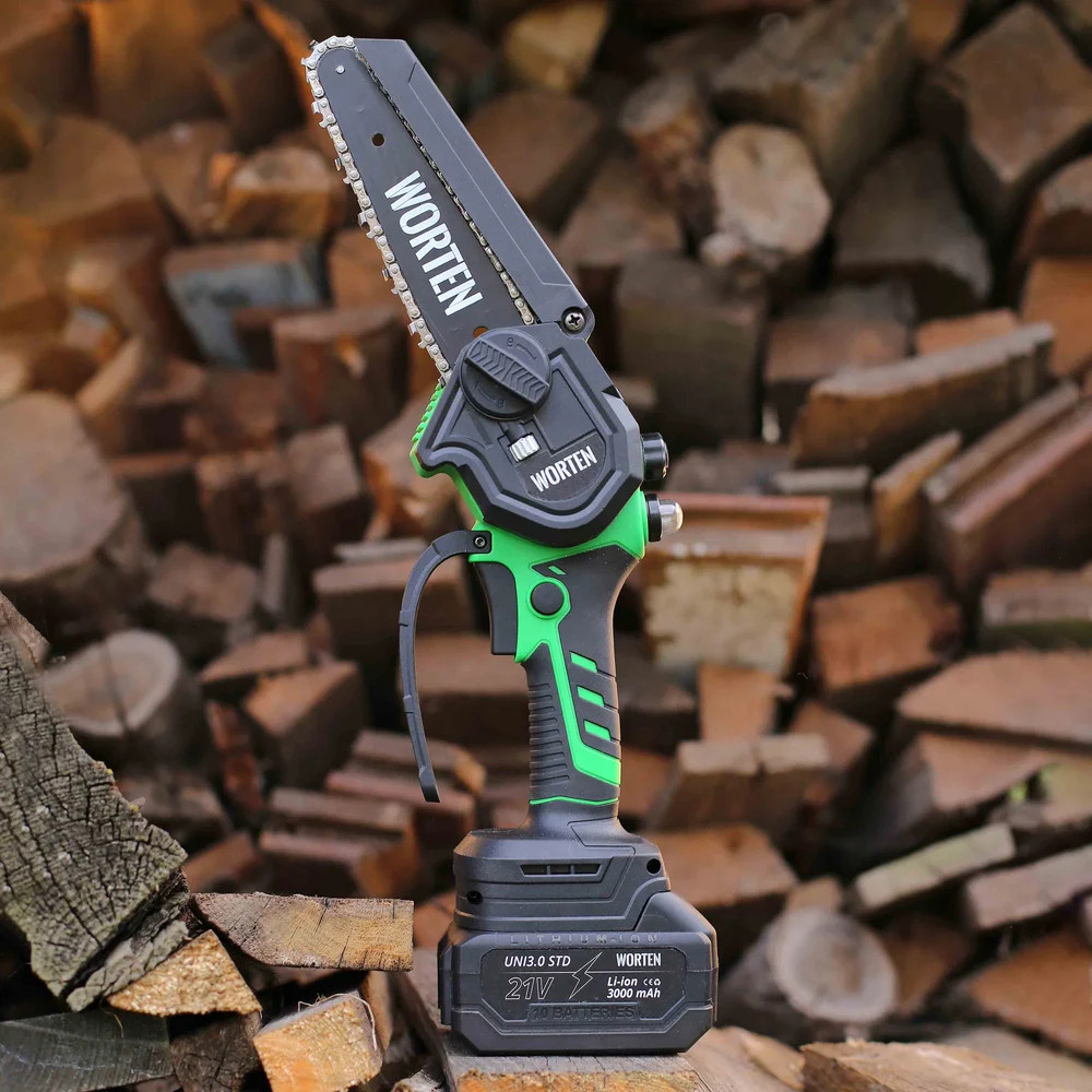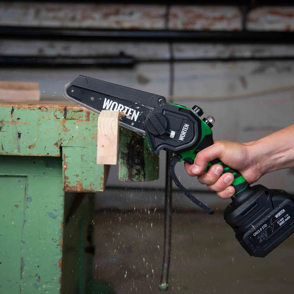 Пила цепная аккумуляторная WORTEN щеточная незаменима при работе в мастерской или в саду для распиливания различных материалов. Предназначена для пропилов в древесине и пластмассе. Инструмент работает от литий-ионного аккумулятора.