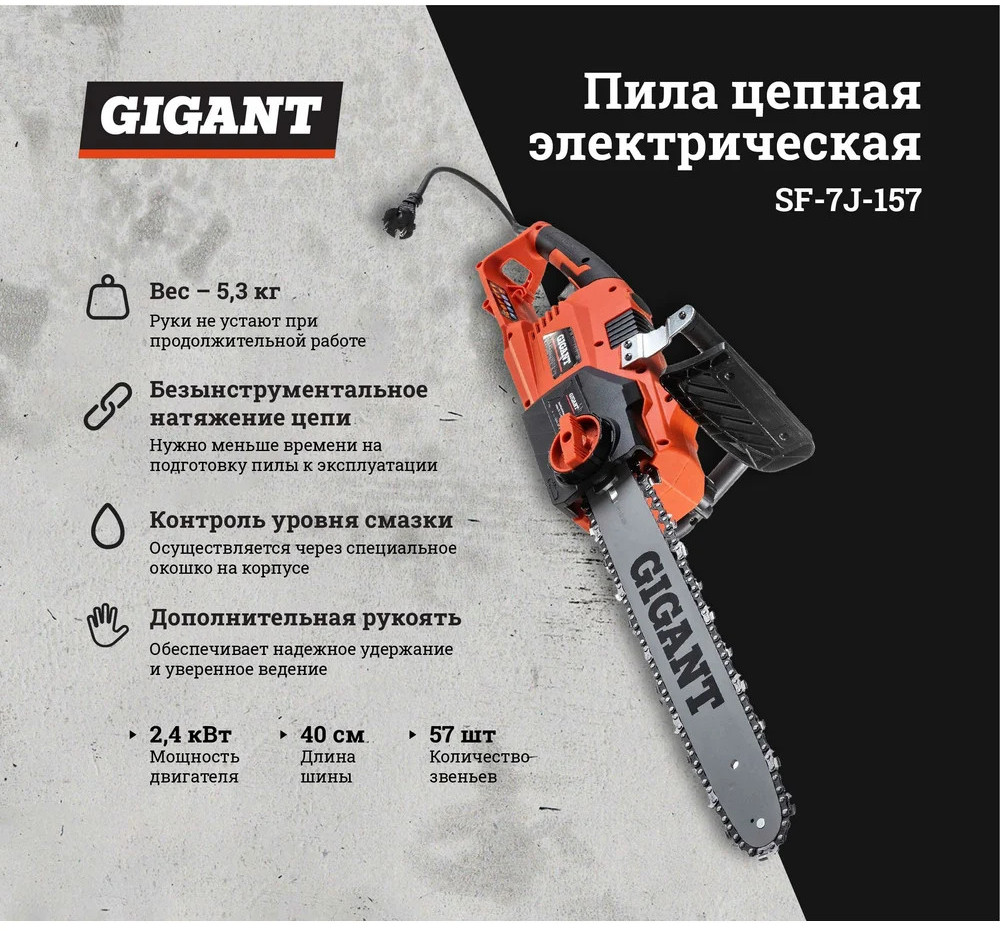Gigant Пила цепная SF-7J-157В данный момент этот товар отсутствует в продаже. Возможно, у нас найдется аналогичный или похожий товар здесь. Электрическая цепная пила Gigant — легкий инструмент для распиливания древесины и строительных материалов, относится к полупрофессиональному классу. Оснащена мощным электроприводом 2400 Вт. В комплект входит 40-сантиметровая шина и цепь с шагом 3/8. Скорость вращения цепи 14 м/с обеспечивает хорошую производительность. Предусмотрен тормоз цепи для безопасной работы с инструментом и система быстрого натяжение цепи без использования дополнительного инструмента. Электропила подойдет для распиловки бревен, валки садовых деревьев, обрезки сучков, раскройки пиломатериала для столярных и плотницких работ, обрезки брусьев при строительстве. Имеет заднюю рукоятку, которая удобно сидит в руке, что гарантирует надежное удержание инструмента. Отсутствие токсичных выхлопов позволяет использовать пилу в закрытом помещении. |