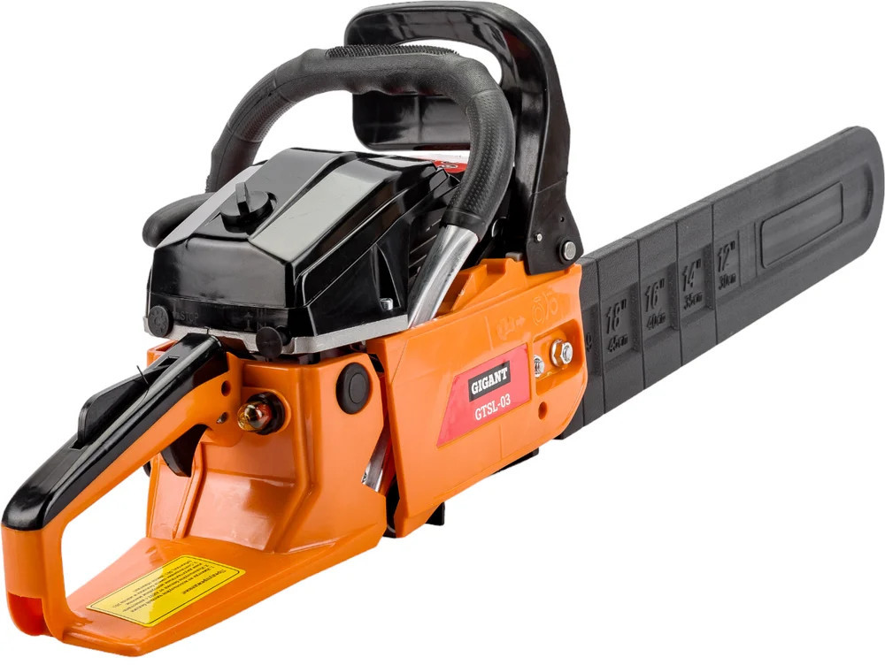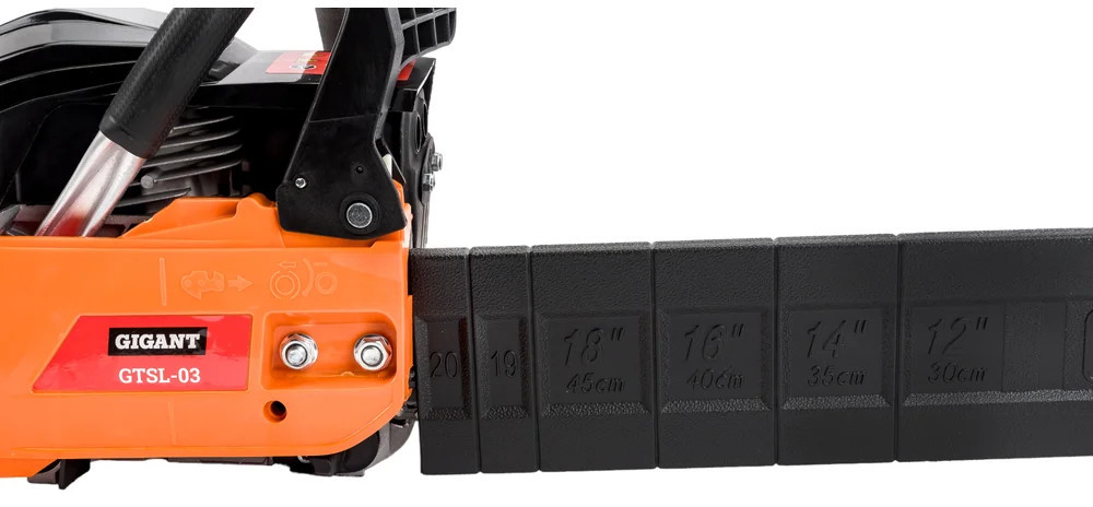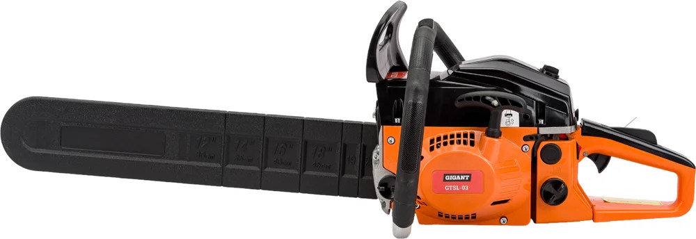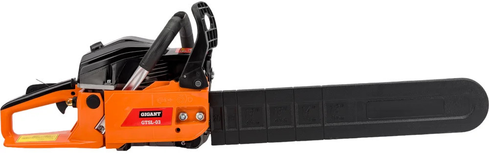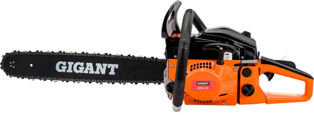 Бензопила Gigant GTSL-03 — прочный и мощный агрегат, позволит справиться с задачами любого уровня сложности. Задняя рукоятка и дополнительная рукоятка гарантируют полный контроль над инструментом. Безопасная работа. При нажатии на передний упор срабатывает тормоз и пильная цепь моментально останавливается. Праймер (насос для подкачки топлива) облегчает запуск холодного двигателя.