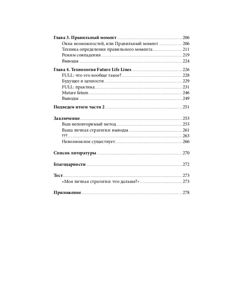 Во второй части включается «машина времени»: читатель учится смотреть из будущего в настоящее, работать с образами «я хочу», «я делаю», «я знаю» и даже с «невозможным будущим», искать правильные моменты для рывка и выстраивать свои Future Life Lines (FULL). Всё аккуратно, структурно и без магии: будущее перестаёт быть туманом и становится полем, с которым можно работать.