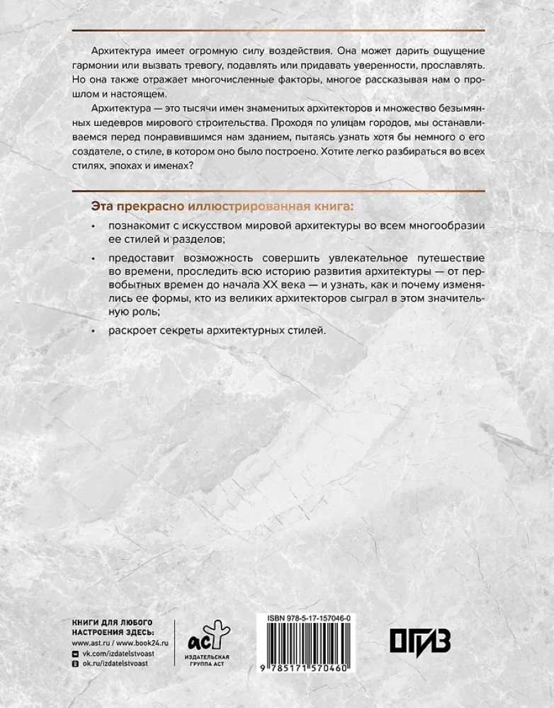 💳 Оплатить за товар можно при получении 🇰🇿 Есть бесплатная доставка по Казахстану от 1 дня 🎁 Копите бонусы с каждой покупки Серия: Искусство. Подарочная энциклопедия Архитектура имеет огромную силу воздействия. Она может дарить ощущение гармонии или вызывать тревогу, подавлять или придавать уверенности, прославлять. Но она также отражает многочисленные факторы, многое рассказывая нам о прошлом и настоящем. Это прекрасно иллюстрированное издание познакомит с искусством архитектуры во всем многообразии ее основных стилей, областей и разделов. Оно будет особенно интересно тем, кто хотел бы проследить всю историю развития архитектуры — от первобытных времен до начала XX века, — понять, как и почему изменились ее формы, кто из великих архитекторов сыграл в этом значительную роль. В книге также раскрываются секреты возведения самых знаменитых архитектурных сооружений, что дает возможность по-новому взглянуть на известные всему миру шедевры. |