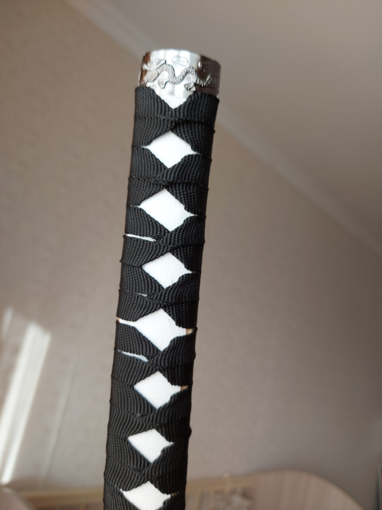 Рукоять ужасная. От слова совсем. На фотографии заявлена чёрного цвета, а фактически белая, обмотаная чёрной верёвочкой. Везде кусочки клея видны. Очень разочарованы.