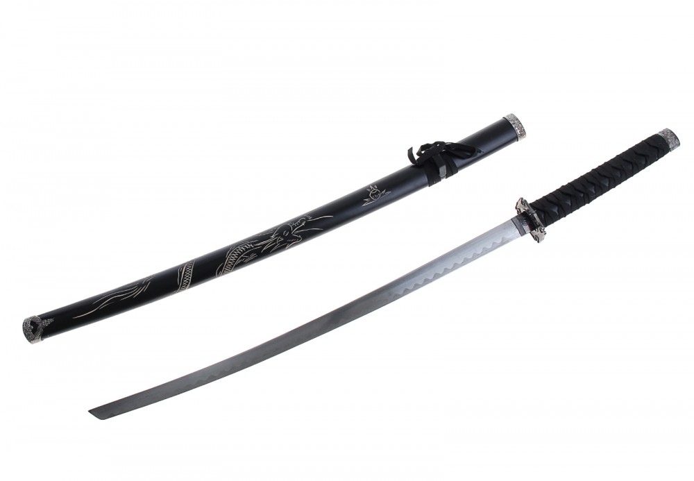 Катана сувенирная на подставке, черные ножны, резной дракон-25% +529 слабое крепление неаккуратная отделка неудобный баланс