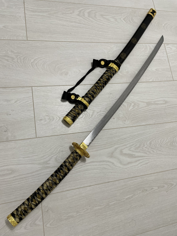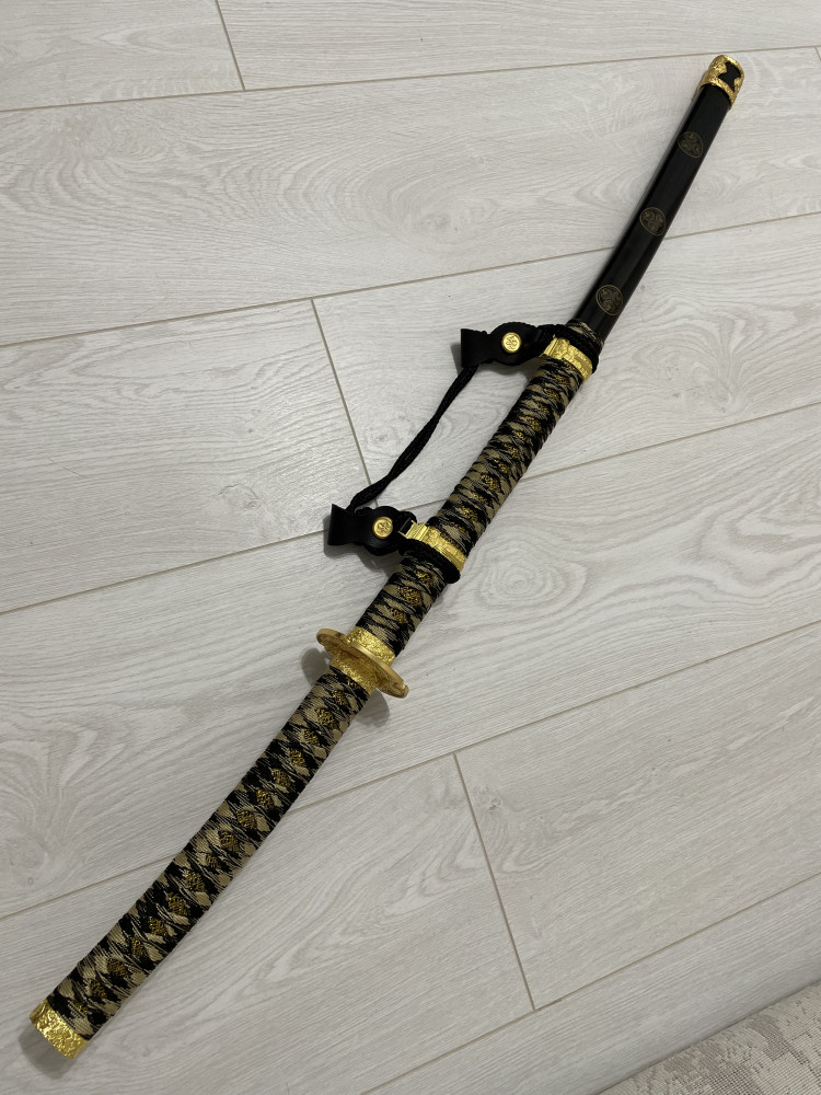 Отзывы «Катана сувенирная, без подставки, дерево, черные ножны, золотые круги, золотистые обмотка и подвес»