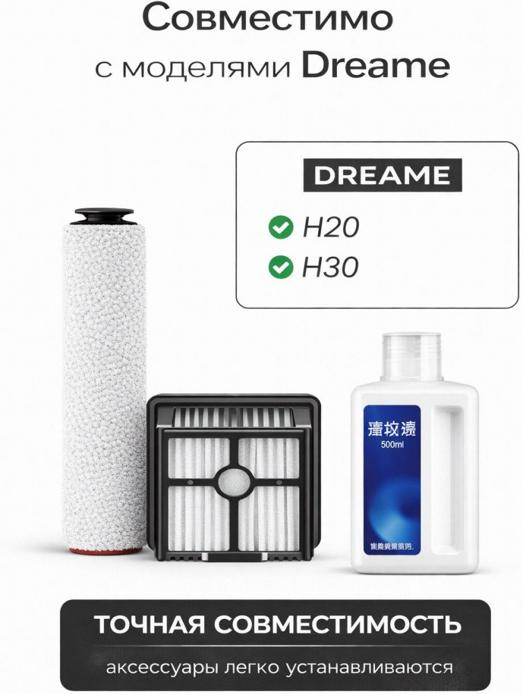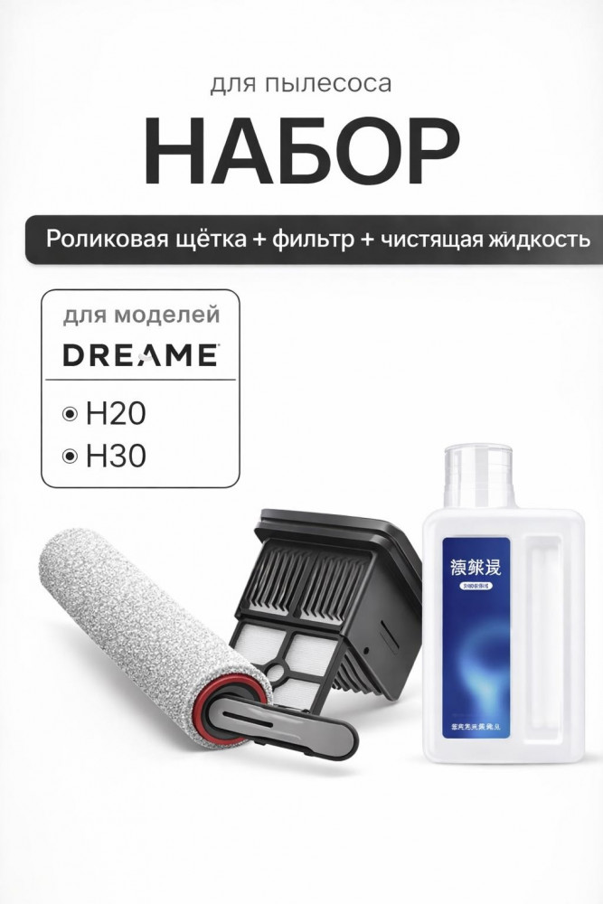 Комплект сменных аксессуаров для моющих пылесосов Dreame H20 и Dreame H30 — роликовая щётка, НЕРА-фильтр и чистящая жидкость 500 мл.