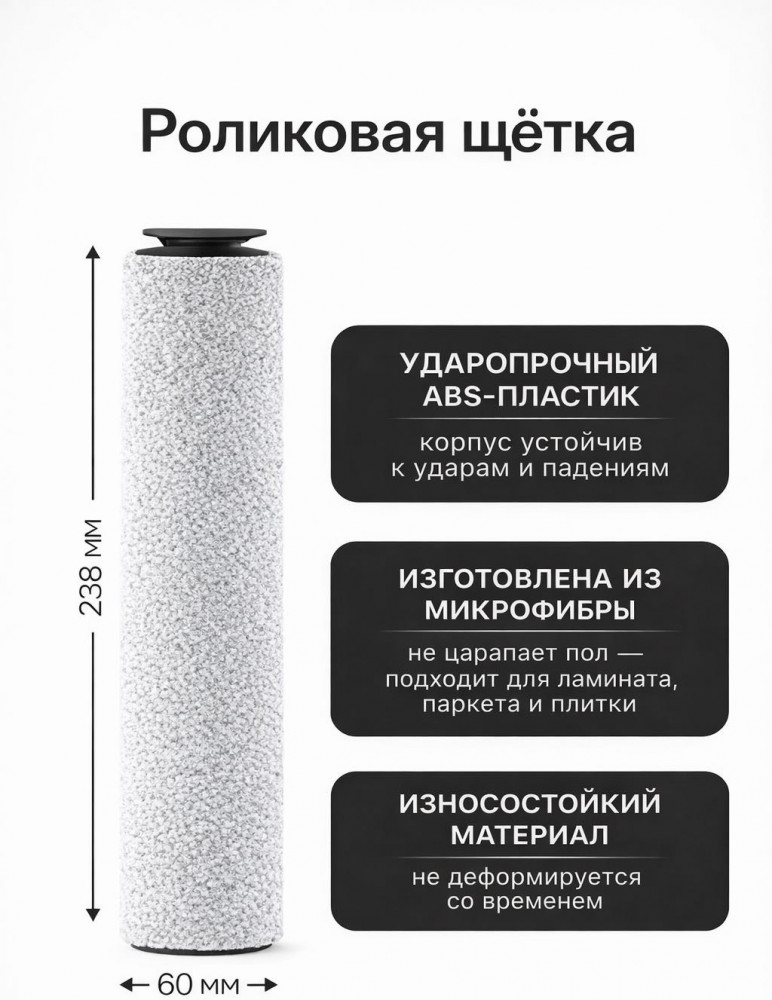 Роликовая щётка из микрофибры бережно очищает напольные покрытия, не царапает ламинат, паркет и плитку, эффективно собирает грязь, пыль и влагу.