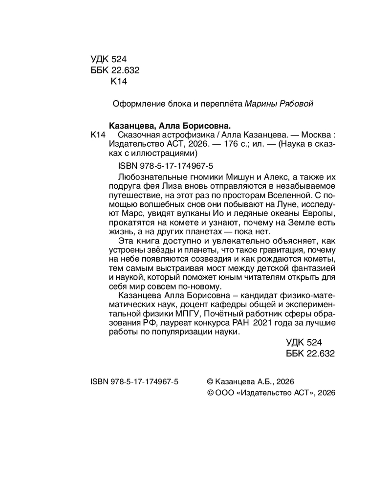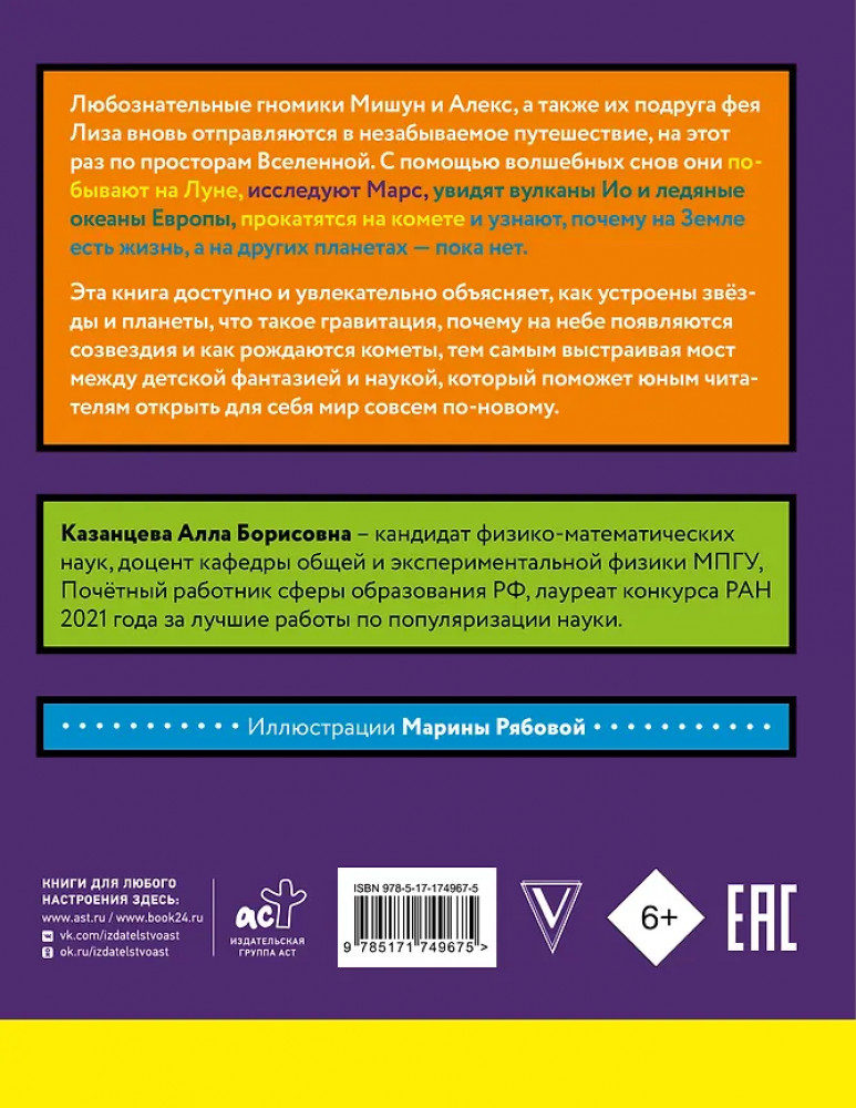 💳 Оплатить за товар можно при получении 🇰🇿 Есть бесплатная доставка по Казахстану от 1 дня 🎁 Копите бонусы с каждой покупки Серия: Наука в сказках с иллюстрациями Любознательные гномики Мишун и Алекс, а также их подруга фея Лиза вновь отправляются в незабываемое путешествие, на этот раз по просторам Вселенной. С помощью волшебных снов они побывают на Луне, исследуют Марс, увидят вулканы Ио и ледяные океаны Европы, прокатятся на комете и узнают, почему на Земле есть жизнь, а на других планетах — пока нет. |