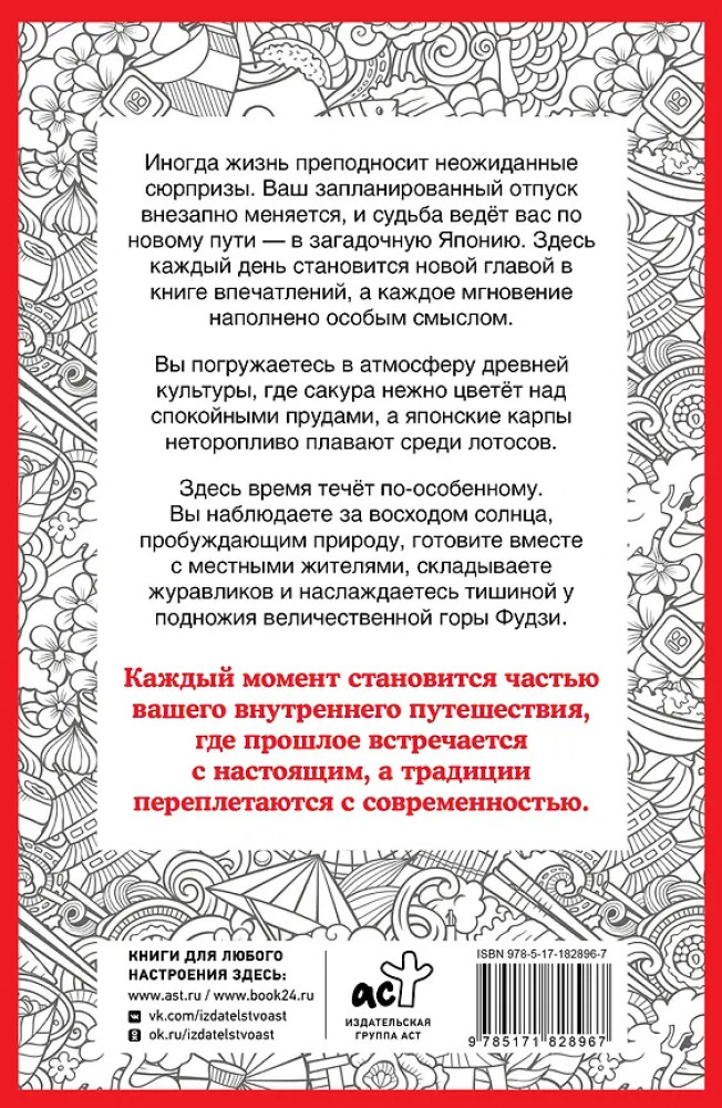 💳 Оплатить за товар можно при получении 🇰🇿 Есть бесплатная доставка по Казахстану от 1 дня 🎁 Копите бонусы с каждой покупки Серия: Для шибко умных Иногда жизнь преподносит неожиданные сюрпризы. Ваш запланированный отпуск внезапно меняется, и судьба ведёт вас по новому пути — в загадочную Японию. Здесь каждый день становится новой главой в книге впечатлений, а каждое мгновение наполнено особым смыслом. Вы погружаетесь в атмосферу древней культуры, где сакура нежно цветёт над спокойными прудами, а японские карпы неторопливо плавают среди лотосов. |
