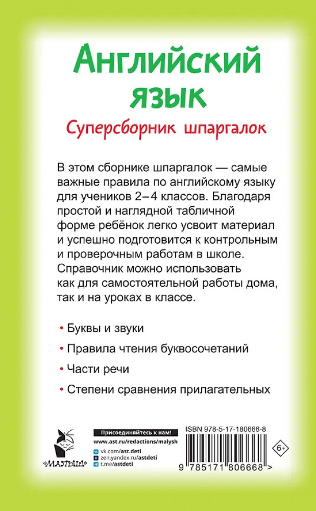 💳 Оплатить за товар можно при получении 🇰🇿 Есть бесплатная доставка по Казахстану от 1 дня 🎁 Копите бонусы с каждой покупки Серия: Цветной справочник в удобном формате «Английский язык. Суперсборник шпаргалок» — это справочное пособие по английскому языку для учеников начальной школы. На его страницах — основные правила английского языка, представленные в виде цветных схем и таблиц. Занимаясь по книге, школьник сможет изучить правила «с нуля» либо повторить уже изученные темы. Пособие можно использовать для подготовки к контрольным и проверочным работам. Для начального образования. |