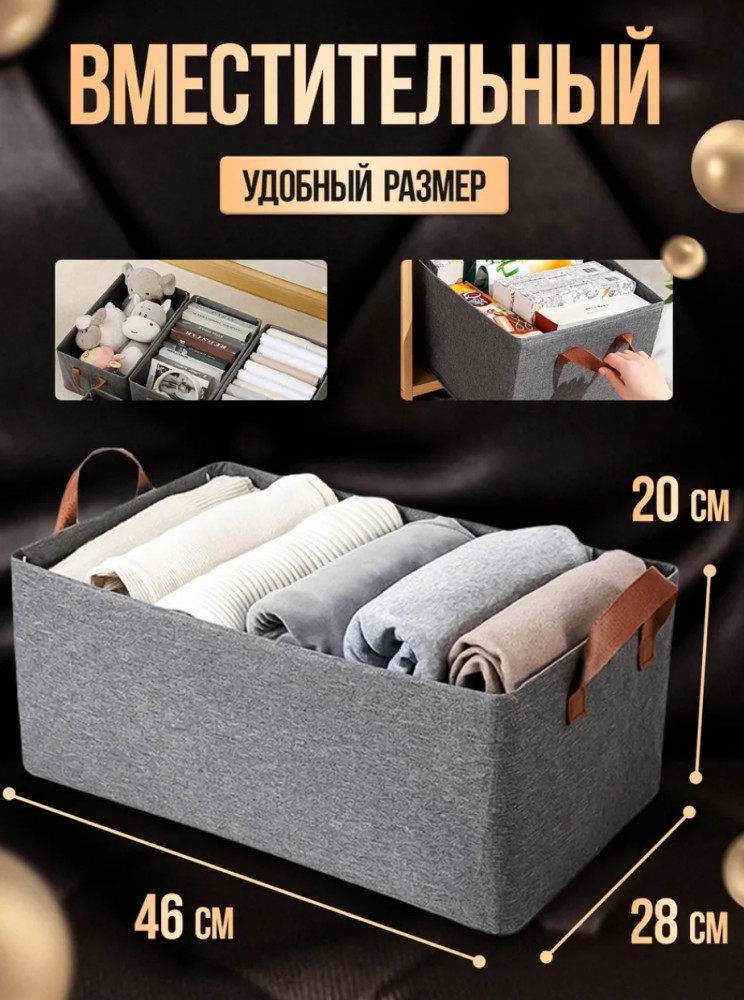 В корзину можно сложить принадлежности для рукоделия, шитья или вязания. Сумка объемом 26 (л) обеспечивает хранение большой емкости, сохранит вашу одежду свежей и чистой, отлично подходят для хранения детской одежды и любых других предметов гардероба. Контейнер прекрасно сохранит надолго свою форму, прочный, практичный и долговечный. Интерьерный тканевый бокс отлично смотрится в гостиной, в шкафах гардеробной и под кроватью. Кофр может быть легко сложен, когда он не используются. Каждый комплект коробок хорошо упакован в надёжную, фирменную упаковку для безопасной транспортировки. Качество нашей продукции соответствует строгим стандартам. Коробки для хранения — это удобные и универсальные аксессуары для хранения вещей, гарантия качества и надежности!
