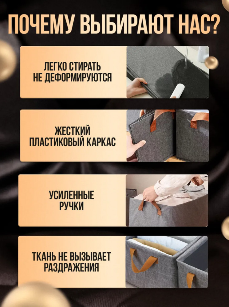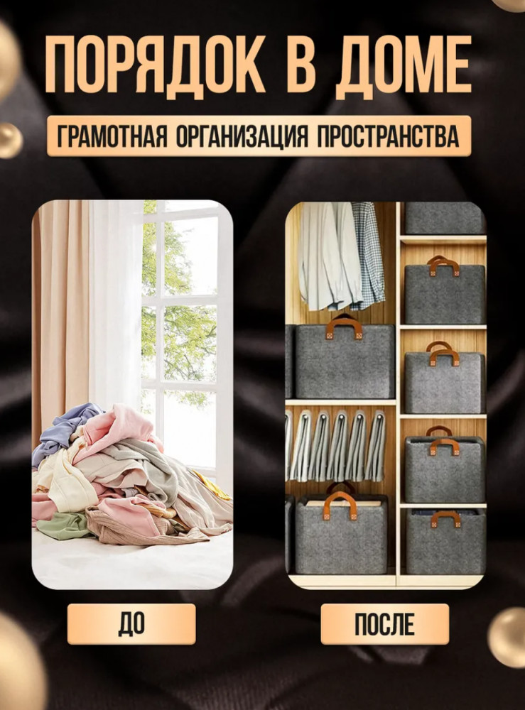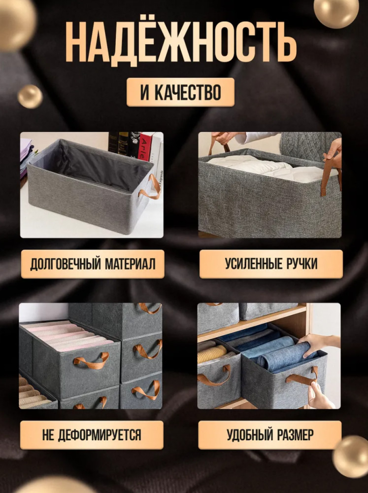 Короб не имеет запаха, изготовлен из плотного, качественного материала — катионик. Материал устойчив к разрывам, не вытягивается и не деформируется. Складная коробка, легкая в сборке и компактная в сложенном виде. Коробки устойчивы к влаге, они подойдут для размещения в ванной комнате. Благодаря складной конструкции они не займут много места в шкафу, а возможность мытья делает их уход простым. Все контейнеры для вещей оснащены крепкими, стильными ручками по бокам для удобной переноски и транспортировки. Ящик идеально подойдет для сортировки постельного белья, повседневной одежды, полотенец, нижнего белья, игрушек, канцелярии, косметики и прочих вещей. Ваши вещи будут аккуратно сложены в шкафу, не занимая много места.