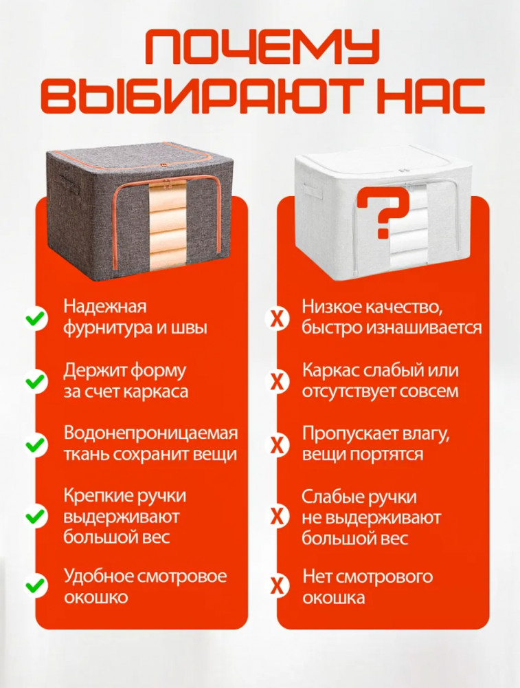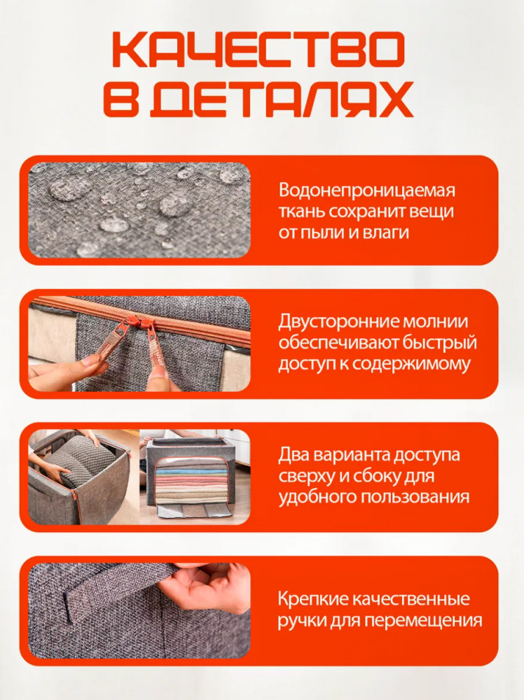 Оптимизируйте свое пространство с нашими функциональными и стильными коробками для хранения вещей! Больше не нужно беспокоиться о беспорядке — наши коробки помогут организовать ваш дом и сохранить ваши вещи в порядке. Представляем вам универсальное решение для хранения вещей — прочные и вместительные коробки для хранения. Используйте их как ящики для хранения вещей в гардеробной, детской комнате, кладовке или на балконе.