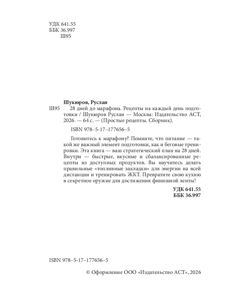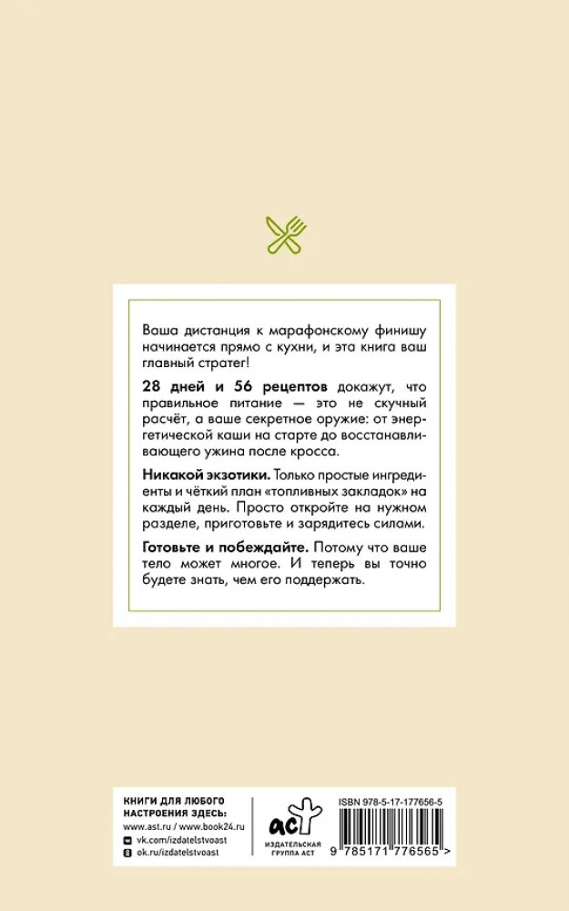 💳 Оплатить за товар можно при получении 🇰🇿 Есть бесплатная доставка по Казахстану от 1 дня 🎁 Копите бонусы с каждой покупки Серия: Простые рецепты. Сборник Готовитесь к марафону? Помните, что питание — такой же важный элемент подготовки, как и беговые тренировки. Эта книга — ваш стратегический план на 28 дней. Внутри — быстрые, вкусные и сбалансированные рецепты из доступных продуктов. Вы научитесь делать правильные «топливные закладки» для энергии на всей дистанции и тренировать ЖКТ. Превратите свою кухню в секретное оружие для достижения финишной ленты! |