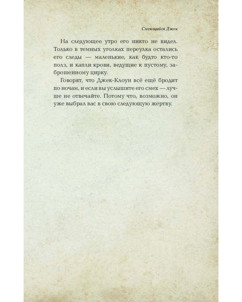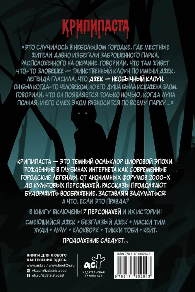 💳 Оплатить за товар можно при получении 🇰🇿 Есть бесплатная доставка по Казахстану от 1 дня 🎁 Копите бонусы с каждой покупки Серия: Крипи-макароны «Это случилось в небольшом городке, где местные жители давно избегали заброшенного парка, расположенного на окраине. Говорили, что там живёт что-то зловещее — таинственный клоун по имени Джек. Легенда гласила, что Джек — необычный клоун. Он был когда-то человеком, но его душа была искажена злом. Говорили, что он появляется только ночью, когда луна полная, и его смех эхом разносится по всему парку...» |