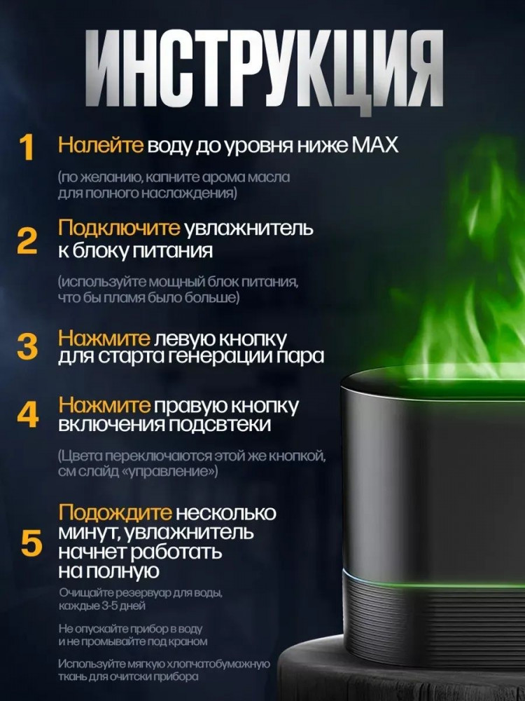 💳 Оплатить за товар можно при получении 🇰🇿 Есть бесплатная доставка по Казахстану от 1 дня 🎁 Копите бонусы с каждой покупки Создайте атмосферу комфорта и уюта в своём доме с помощью ультразвукового увлажнителя воздуха. Этот компактный и стильный прибор не только эффективно увлажняет воздух, но и станет прекрасным дополнением к вашему интерьеру, благодаря приятной подсветке корпуса и эффекту пламени. |