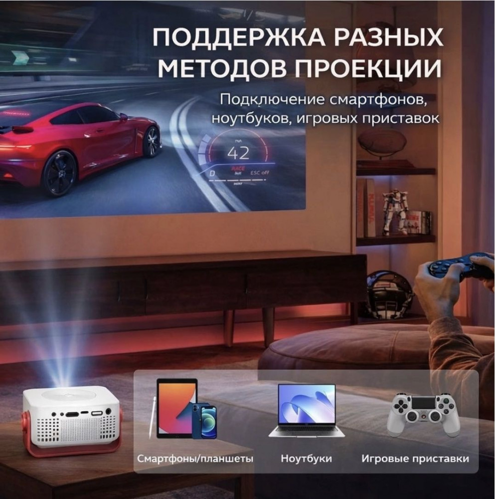 Благодаря компактным размерам мини-проектор занимает минимум места и подходит для использования в спальне, детской комнате или гостиной. Современный и аккуратный дизайн гармонично вписывается в любой интерьер. Домашний проектор прост в использовании и подходит для семейного просмотра, детского контента и вечернего кино. Он позволяет создать атмосферу домашнего кинотеатра без сложной установки и громоздкого оборудования. Проектор станет отличным выбором для тех, кто ищет небольшой проектор для дома, удобный в повседневном использовании и подходящий для просмотра на стене или потолке.