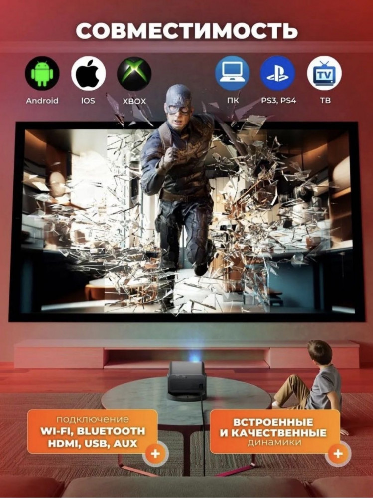 Устройство поддерживает несколько типов разъёмов, включая AUX, HDMI и USB, благодаря чему легко подключается к ноутбукам, приставкам, флеш-накопителям и другим источникам сигнала. Проектор совместим с операционными системами Android, Windows и iOS, поэтому вы можете воспроизводить фильмы и видео прямо со смартфона, планшета или компьютера. Поддержка формата Full HD обеспечивает чёткое изображение, а встроенные динамики создают качественный звук без необходимости подключения дополнительной акустики.