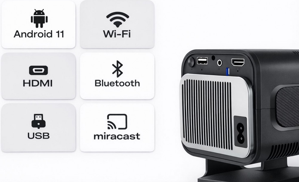 Встроенные модули Wi-Fi и Bluetooth обеспечивают удобное беспроводное подключение смартфонов, ноутбуков, планшетов и аудиоустройств без лишних кабелей. Яркая LED-лампа с ресурсом до 50 000 часов гарантирует долгий срок службы, а световой поток 300 люмен подходит для комфортного просмотра в затемнённых помещениях. Функции горизонтальной и вертикальной коррекции трапецеидальных искажений позволяют быстро настроить ровное изображение даже при установке под углом.