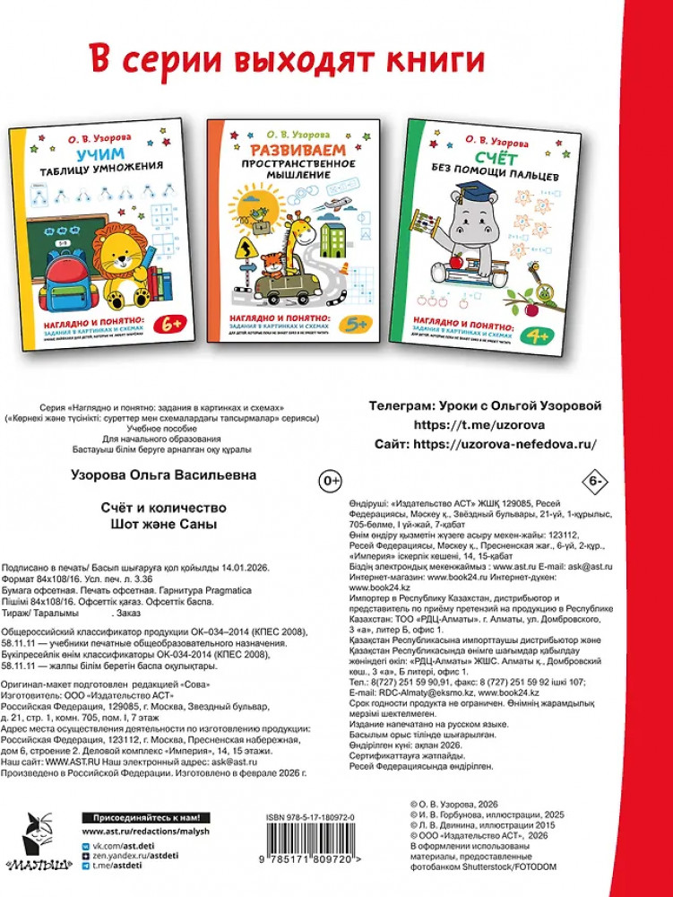 💳 Оплатить за товар можно при получении 🇰🇿 Есть бесплатная доставка по Казахстану от 1 дня 🎁 Копите бонусы с каждой покупки Серия: Наглядно и понятно: задания в картинках и схемах «Счёт и количество» — интересная и познавательная книга, благодаря которой ребёнок познакомится с цифрами, потренируется их писать, научится считать и усвоит количественные понятия (больше-меньше, часть и целое и т. д.), которые являются фундаментом для последующего успешного развития математических способностей. Современная наглядная подача информации: задания в картинках простые, интересные и понятные! Для дошкольного возраста. |
