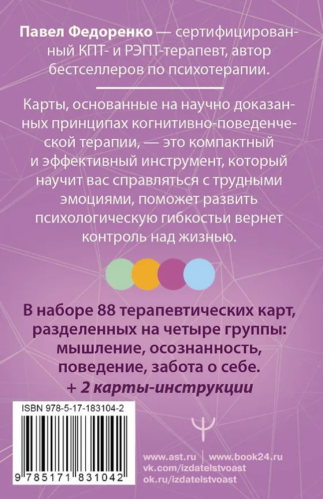💳 Оплатить за товар можно при получении 🇰🇿 Есть бесплатная доставка по Казахстану от 1 дня 🎁 Копите бонусы с каждой покупки Серия: Универсальные карты Павел Федоренко — магистр психологии, сертифицированный КПТ- и РЭПТ-терапевт, генеральный директор Клиники когнитивной психотерапии, генеральный директор Института Когнитивно-поведенческой психотерапии, основатель Академии здорового мышления. «КПТ: карты самопомощи» — компактный и эффективный инструмент, надежный союзник в заботе о психическом здоровье, — научит вас справляться со сложными эмоциями, поможет развить психологическую гибкость и вернет контроль над жизнью. |