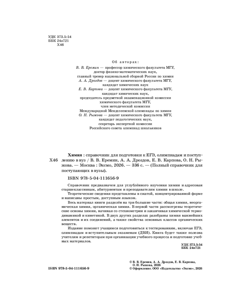 💳 Оплатить за товар можно при получении 🇰🇿 Есть бесплатная доставка по Казахстану от 1 дня 🎁 Копите бонусы с каждой покупки Серия: Полный справочник для поступающих в вузы Справочник адресован тем, кто хочет овладеть химией на углубленном уровне, систематизировать знания и быть готовыми к любым экзаменационным испытаниям. Авторы — профессора и доценты химического факультета МГУ, имеющие непосредственное отношение к подготовке школьников к олимпиаде по химии: В. В. Еремин — главный тренер национальной сборной России по химии, Е. В. Карпова — член методической комиссии Международной Менделеевской олимпиады по химии, О. Н. Рыжова — секретарь экспертной комиссии Российского совета олимпиад школьников, А. А. Дроздов — кандидат химических наук. Пособие адресовано ученикам 10–11 классов, учителям и репетиторам. Книга поможет подросткам подготовиться к урокам, ЕГЭ, олимпиадам и ДВИ по химии. |